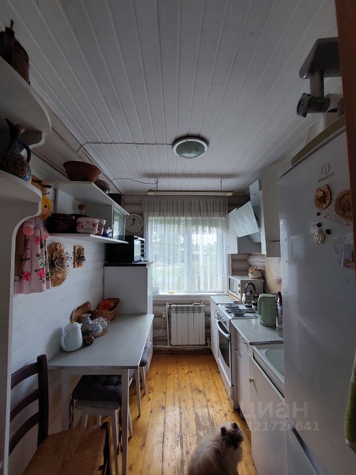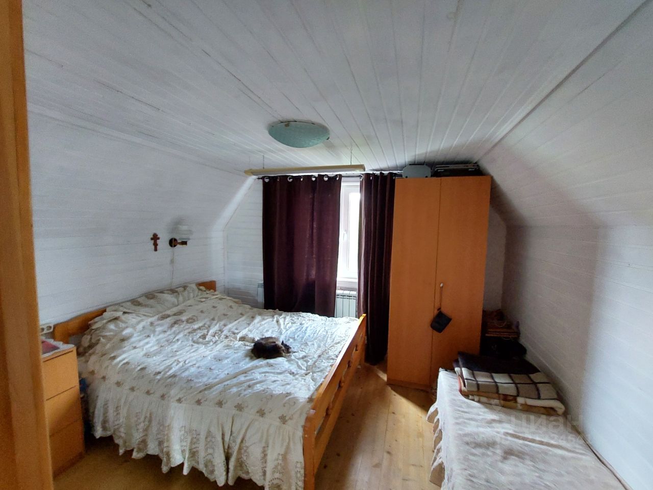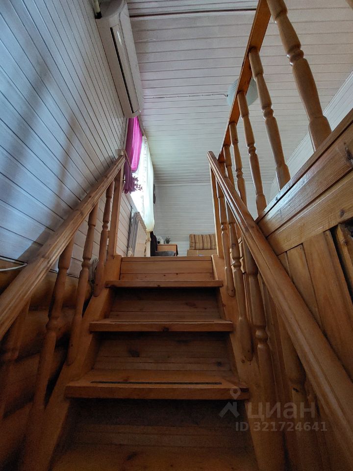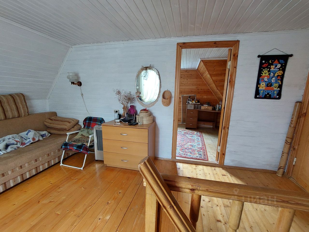 Дом-сруб, отопление электрическое, есть печь-камин, установлен кондиционер. На первом этаже с/у, кладовка, кухня и гостиная. На втором две спальни.