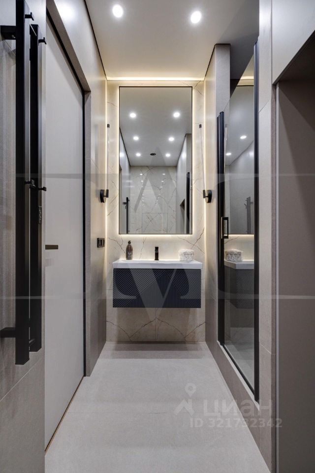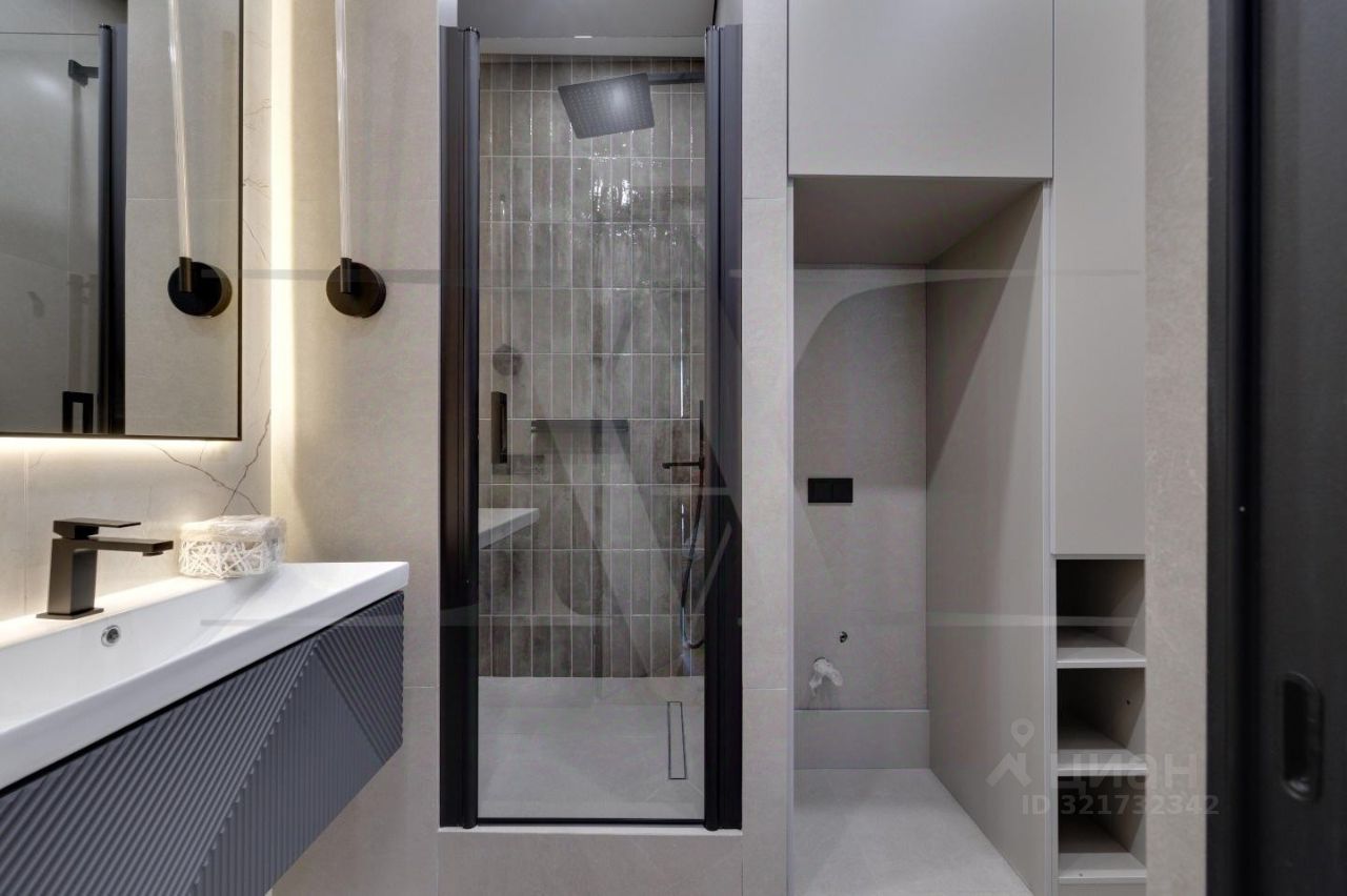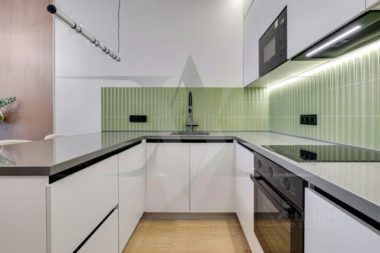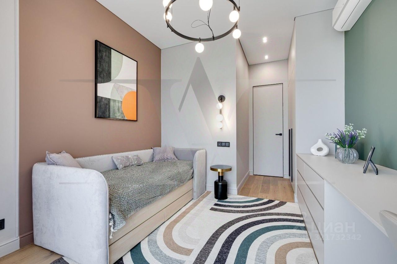Ремонт выполнен по индивидуальному дизайн-проекту с использованием качественных современных материалов. Планировочное решение: кухня-гостиная 26 кв.м, спальня 13 кв. м., совмещенный санузел, 2 гардеробные. Выполнены несколько сценариев освещения (карнизная подсветка, споты, освещение зоны TV, подшторная подсветка) в которых преобладают люстры итальянского бренда Odeon Light.Новая мебель, кухня с техникой и предметы интерьера входят в стоимость.