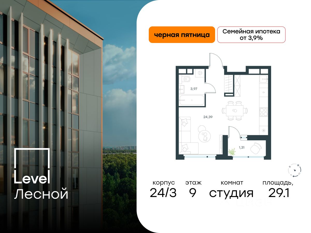В районе, утопающем в густой зелени лесов, многочисленных парков и скверов, продаётся студия площадью 29.10 кв.м с отделкой white box. Квартира расположена на 9 этаже в жилом комплексе комфорт-класса Level Лесной (компания Level Group/Левел групп).