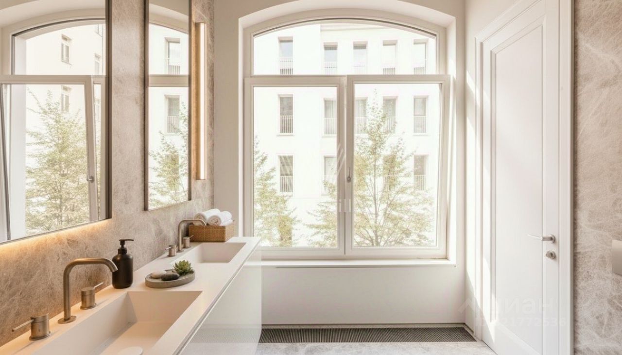 Апартаменты с дизайнерской отделкой площадью 94 м² расположены на втором этаже. В оформлении использованы фактуры дерева и гранита. Установлена кухня со встроенной бытовой техникой. Спланированы кухня-гостиная, мастер-спальня с собственной гардеробной и ванной комнатой с окном, гостевой санузел, постирочная и прихожая с гардеробной. Широкоформатные арочные окна ориентированы на две стороны света, открываются виды на благоустроенную территорию комплекса.