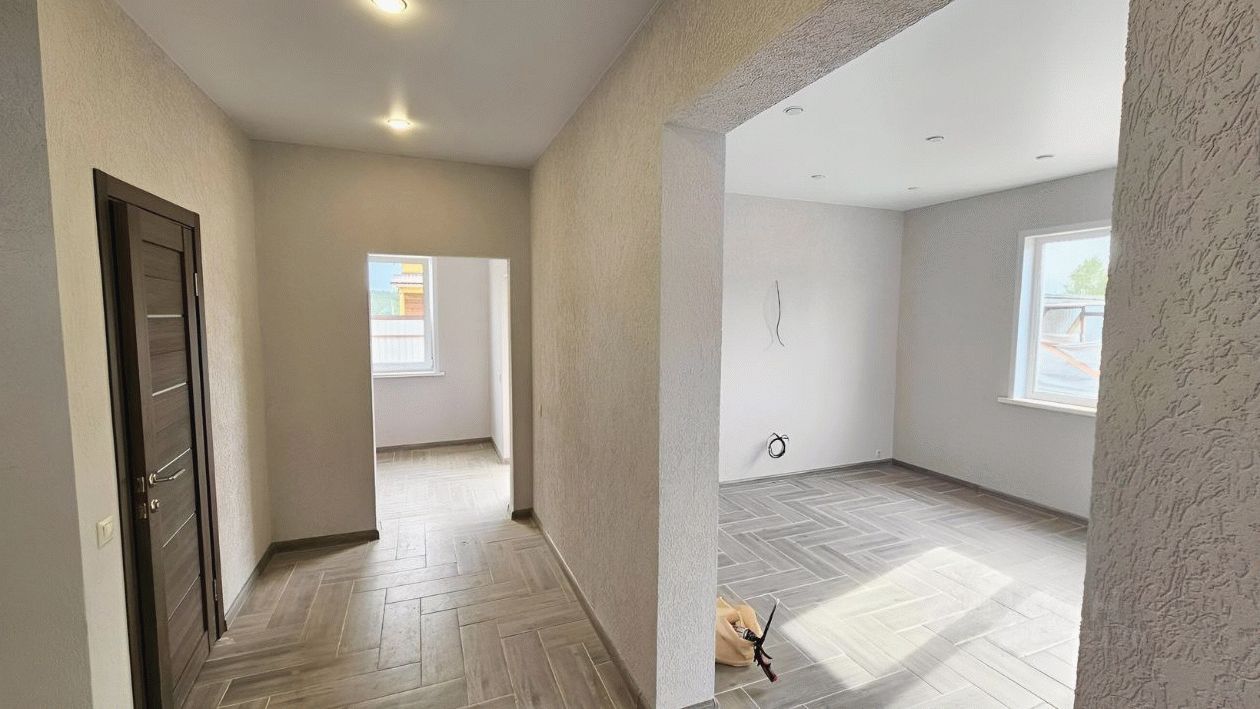 Спешите забронировать. Продажа жилого дома с ремонтом под ключ. Продаем жилой дом, два этажа Конструктив: Фундамент ленточный (заглубленный на 50-60 см), цоколь 50-60 см, внутри утрамбованный песок, сверху ж/б плита. Стены газосиликатные блоки, толщина 25х20. Снаружи стен утеплитель, армирующая сетка, декоративная штукатурка Короед, покрашен. Внутри стены оштукатурены, декоративная штукатурка Короед, покрашены. Первый и второй этажи - теплый пол (специальная жидкость, циркуляция от котла). На первом и втором этажах совмещенные санузлы, в керамической плитке, установлено сантехническое оборудование. Стеклопакеты ПВХ, двухкамерные. Установлены межкомнатные двери. Входная дверь металлическая, с терм-разрывом. Натяжные потолки, точечные светильники над кухонной зоной. Свет 15кВт (три фазы). Вода скважина, канализация два колодца по системе слив-перелив. Участок огорожен по периметру. Калитка, въездные ворота.