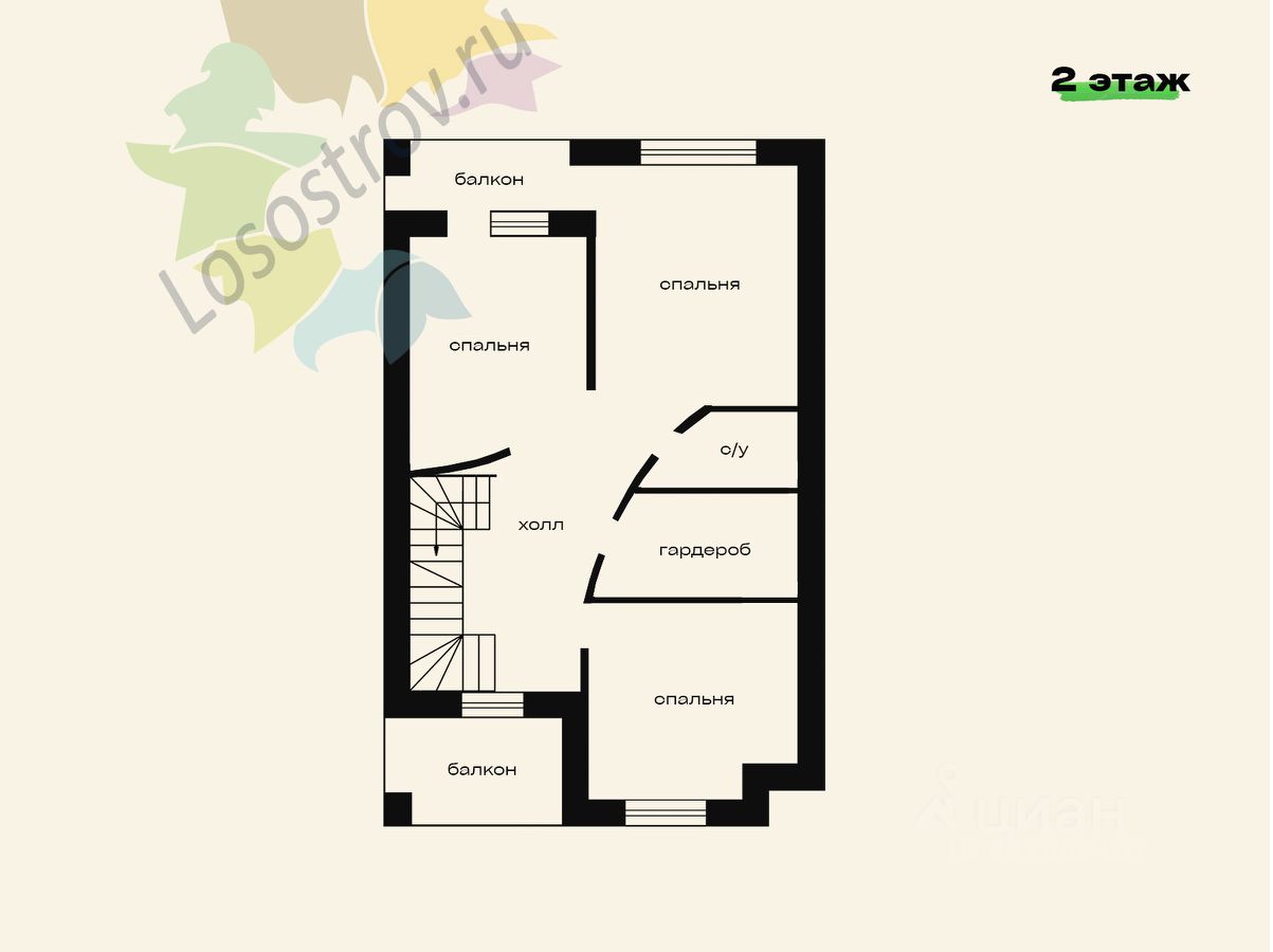 На 2-м этаже: холл, 3 спальные комнаты, ванная комната, гардеробная, 2 балкона с выходом из спальни и видом на лес.