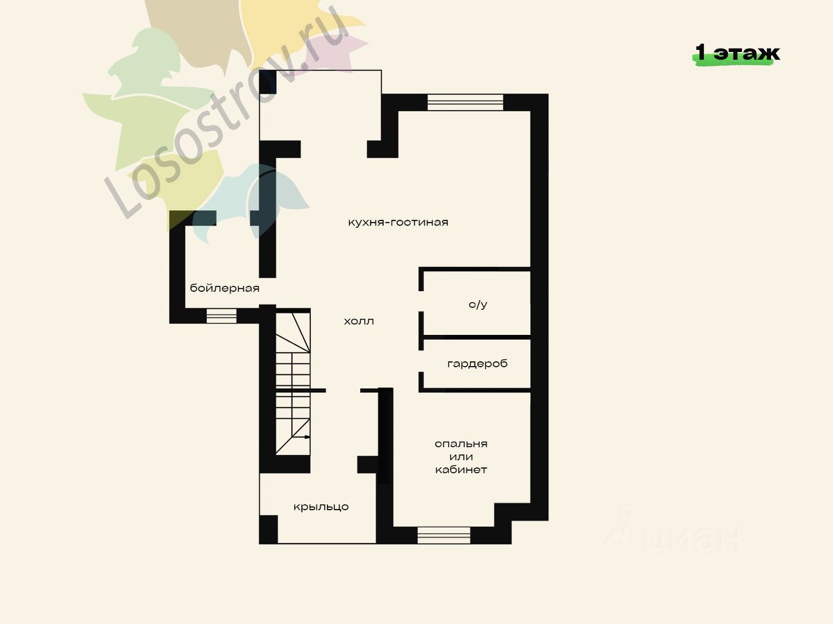 На 1-м этаже: холл, спальня-кабинет, гардеробная, с/у, кухня-гостиная с выходом на участок, котельная.