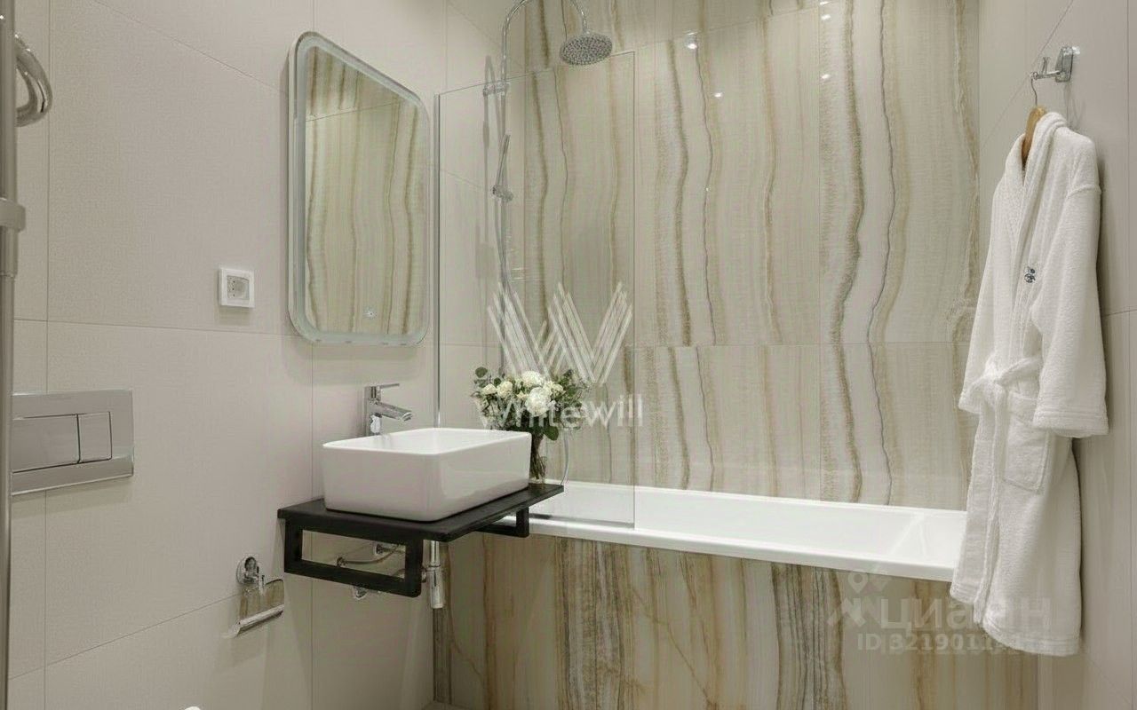 В квартире выполнена дизайнерская отделка в светлых лаконичных тонах. В оформлении использованы фактуры мрамора и дерева. Установлена индивидуальная система кондиционирования. Квартира полностью готова к проживанию: меблирована и укомплектована бытовой техникой Kuppersberg и Weissgauff.