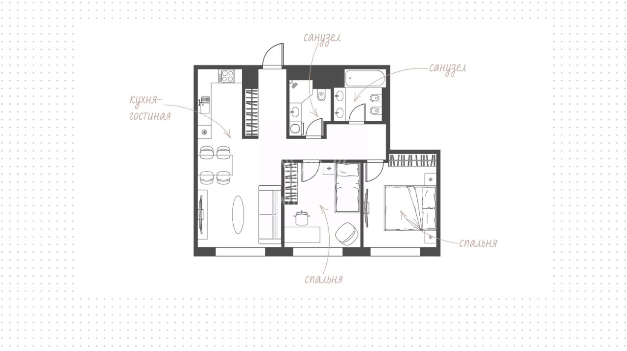 Планировка включает кухню-гостиную с обеденной зоной, две спальни, две ванные комнаты и холл. Дополнительно предусмотрены места хранения вещей. Благодаря широкоформатному остеклению пространство наполнено естественным светом и теплом, открываются виды на Матвеевский лес и проспект Генерала Дорохова.