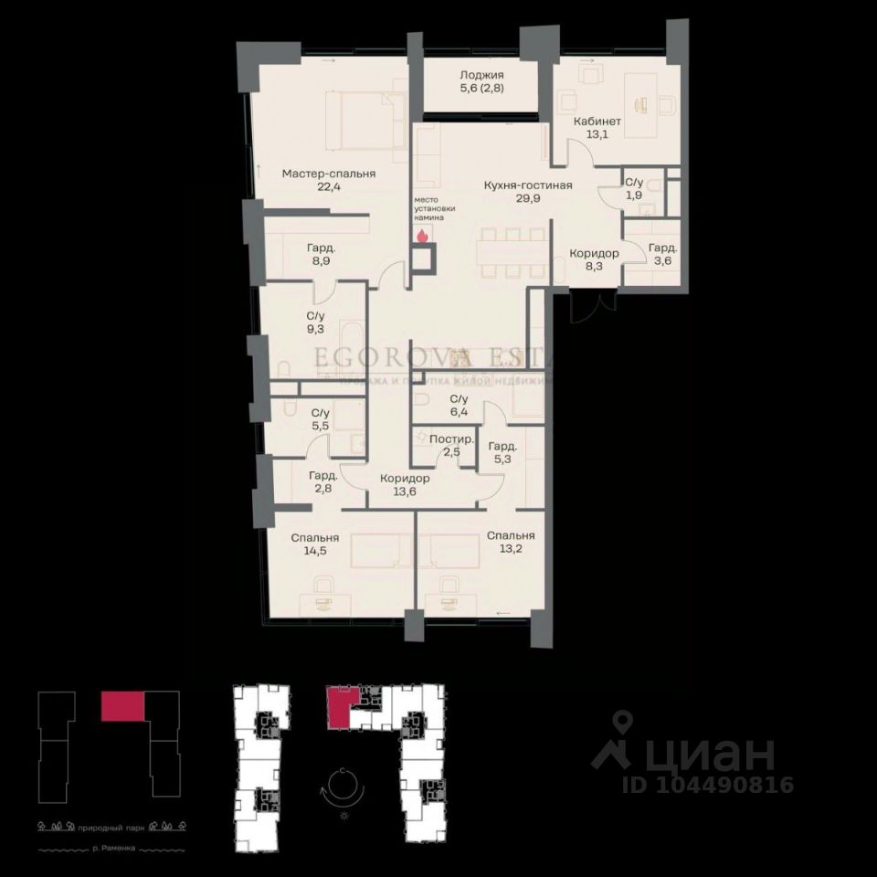 Планировка: - просторная кухня-гостиная с выходом на лоджию, - мастер-спальня с гардеробной и большим санузлом с окном, - две спальни, каждая из которых также имеет санузел и гардеробную, - гардеробная при входе, - гостевой санузел, - кабинет либо можно за счет него увеличить зону гостиной.