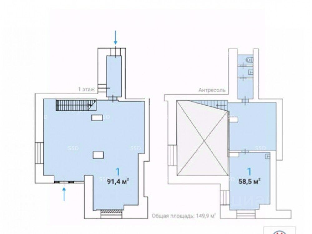 Технические характеристики: Общая площадь -149.9м2 Антрисоль - 58,5 м2, высота потолка - 2,3м 1 этаж - 91.