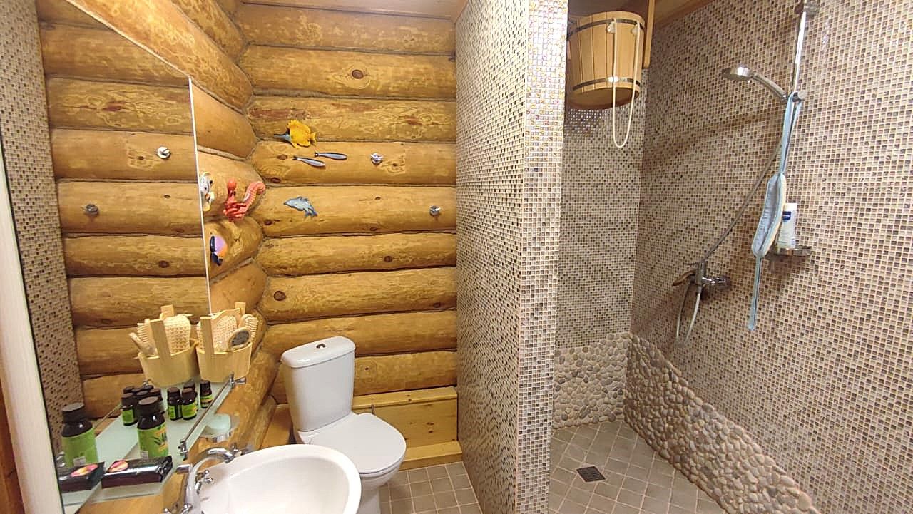 Лучшее предложение в коттеджном поселке, на берегу Можайского водохранилища! В продаже 3 великолепных бревенчатых строения из Архангельской сосны, на красивом участке 20 соток! Дом 185 кв.м, 2 этажа, полностью меблирован, удобная лестница, заходите и живите! Планировка: 1 этаж- прихожая, гостиная с финским камином, кухня с бытовой техникой, спальня, сан.узел с душевой кабиной, бойлерная, веранда, 2 этаж: 3 спальни, сан.узел с ванной, холл-библиотека с балконом. Баня: парная для большой компании, комната отдыха, сан.узел. Гараж 136 кв.м, на 2 машины, с гостевым этажем: холл, сан.узел, просторная комната, есть подводка для кухни, а лестница - художественное произведение. Навес для садовой техники, которая тоже остается Вам!