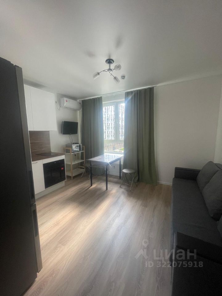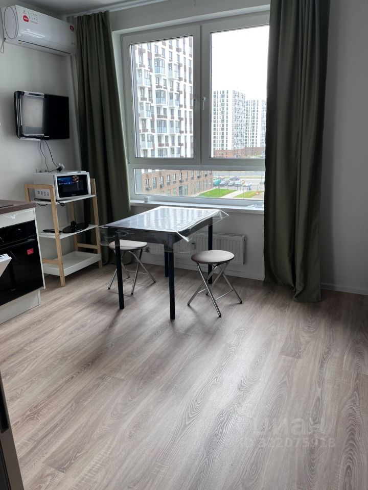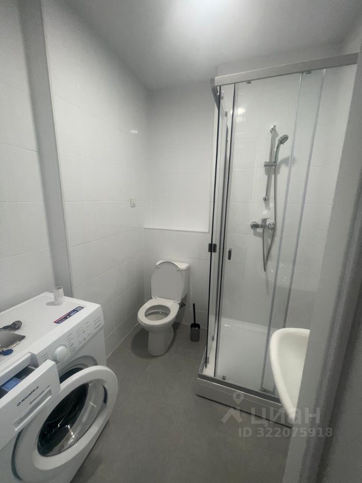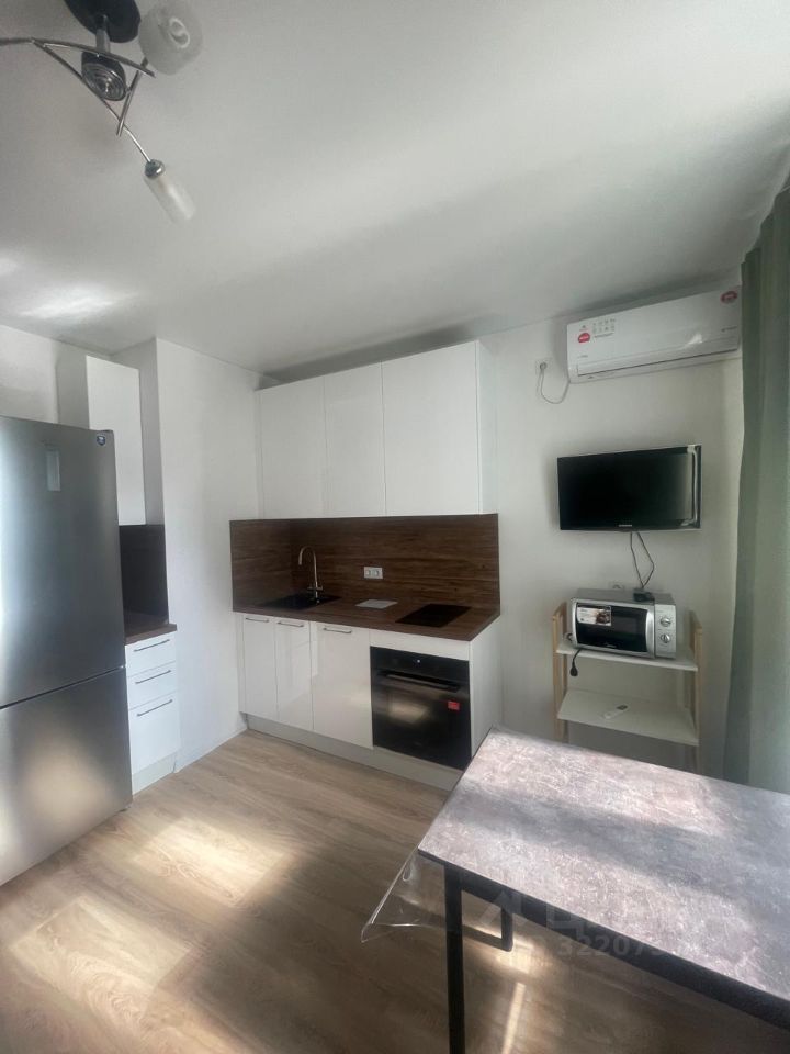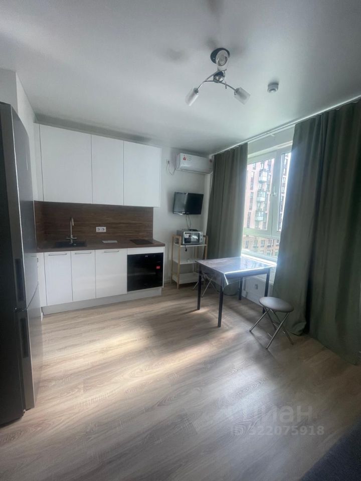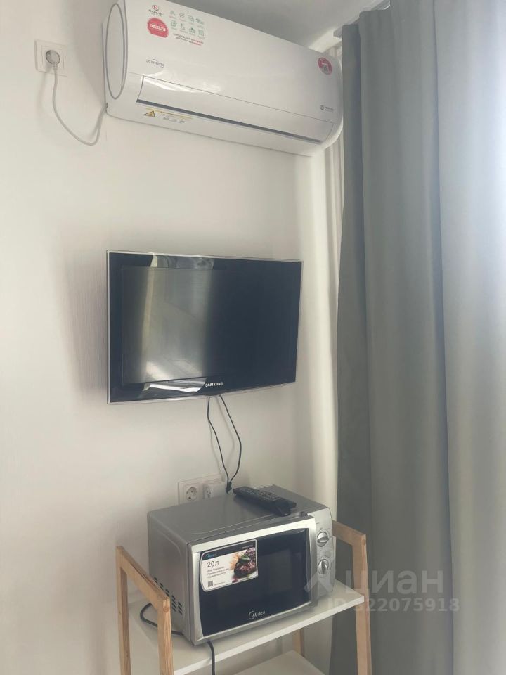 В квартире сделан современный евроремонт. Пространство студии обставлено мебелью, есть всё необходимое для комфортного проживания. На кухне установлена современная техника: холодильник, посудомоечная машина, а также кондиционер и телевизор для вашего удобства. В совмещённом санузле находится душевая кабина, а также стиральная машина.