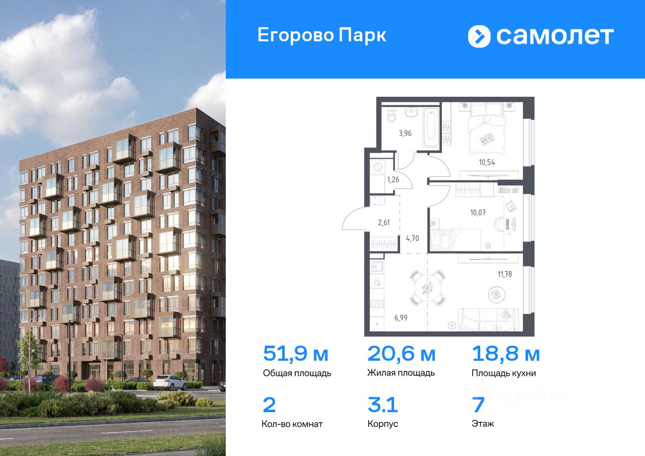 Строим кварталы для жизни с заботой о будущем. Предлагается 2-комнатная квартира комфорт-класса 51,91 кв.м в корпусе 3.1 на 7 этаже, в ЖК ''Егорово Парк''