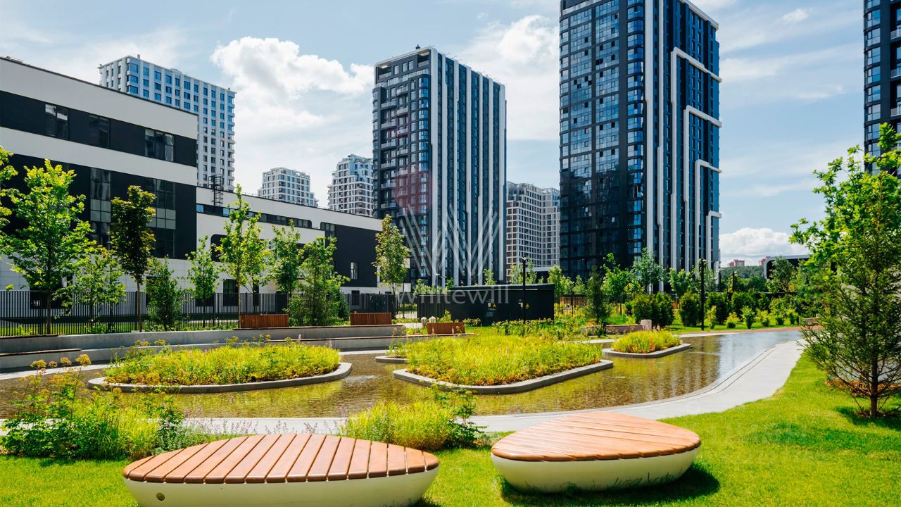 Главное о локации. Комплекс расположен в Хорошёво-Мнёвниках, на берегу Москвы-реки. Через реку — парк ''Крылатские холмы'' с велосипедными трассами и Гребной канал с бассейном и спортивными залами. В десяти минутах — Москворецкий дендропарк и Тереховский пруд для прогулок и пикников. Для семей рядом школа 1517, лицей 1560 и детский сад ''Разные детки''. За 15 минут на машине можно доехать до ТТК и Москва-Сити, а пешком дойти до метро ''Терехово'' за 10 минут. Таким образом, район совмещает жизнь у воды, доступ к зелёным массивам и быструю связь с центром.