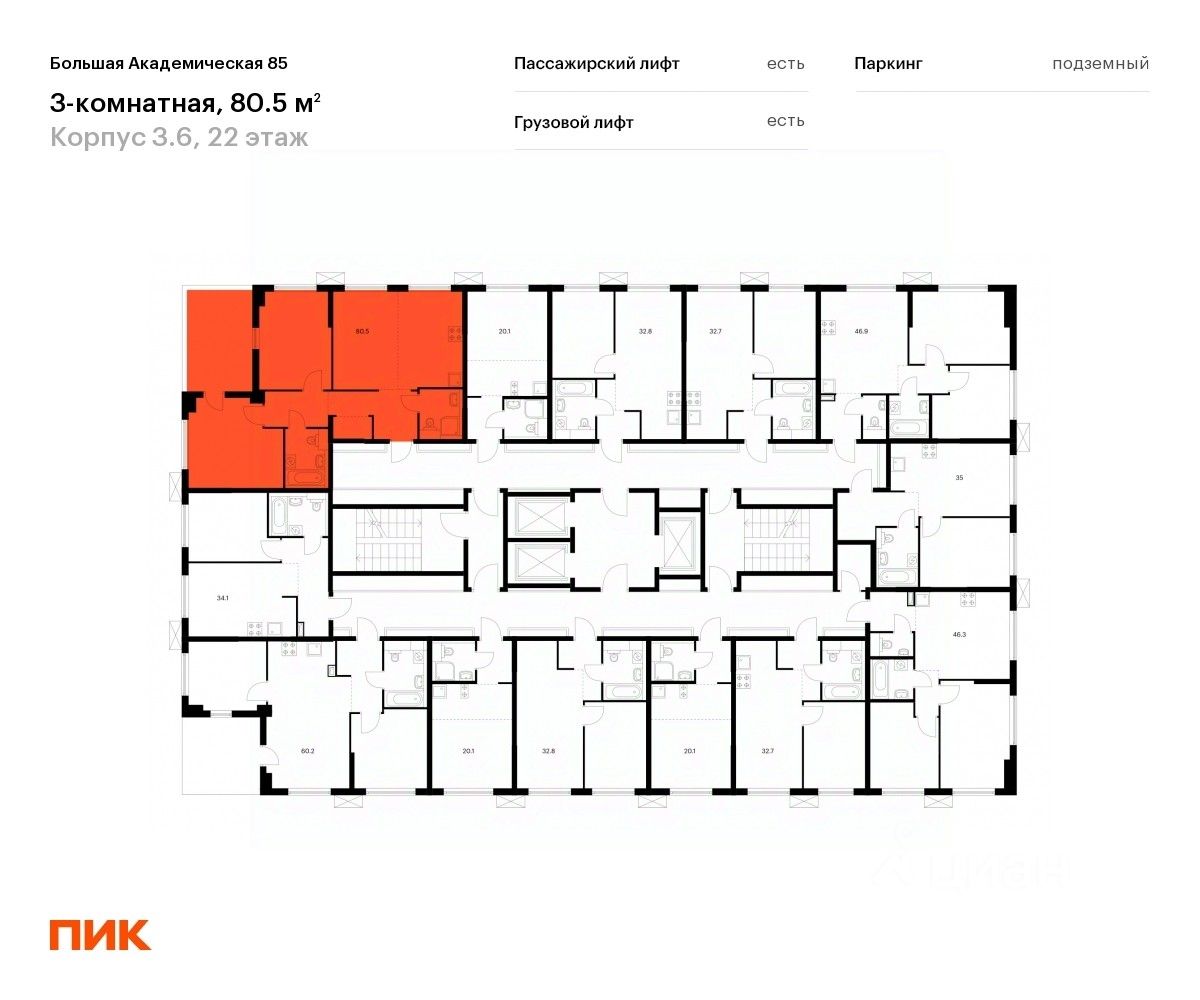 Продаётся 3-комн. апартаменты площадью 80,5 кв.м на 22 этаже 24 этажного дома (Корпус 3.6, Секция 2) проекта ПИК Большая Академическая 85. Светлый просторный подъезд на уровне земли, функциональная планировка, большие окна, c отделкой.