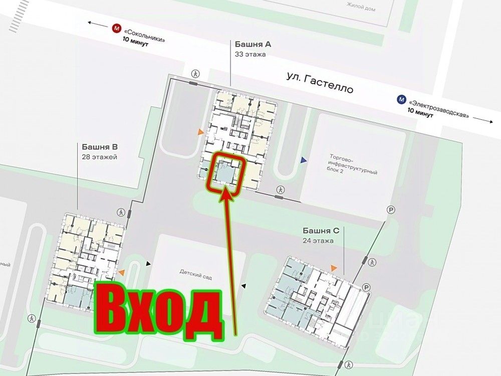 Продажа помещения свободного назначения в новом ЖК бизнес-класса SOKOLNIKI, по адресу: ВАО, Москва, ул. Гастелло, 30, площадью 43 кв.м. В пешей доступности находятся две станции метро — ''Сокольники'' и ''Электрозаводская''. Удобный выезд на ТТК, шоссе Энтузиастов и Садовое кольцо. . . ЖК состоит из 3 башен высотой 24, 28 и 33 этажа. Включает в себя 763 квартиры (2 289 жителей) с чистовой и дизайнерской отделкой (быстрое заселение). В радиусе 10-15 минутной пешей доступности проживает 12 600 человек (по данным ЦПИ). . . Ввод в эксплуатацию 1-й квартал 2027 года. . . Технические характеристики : . 1 этаж 33-х этажного жилого дома, площадью 43 кв.м. .