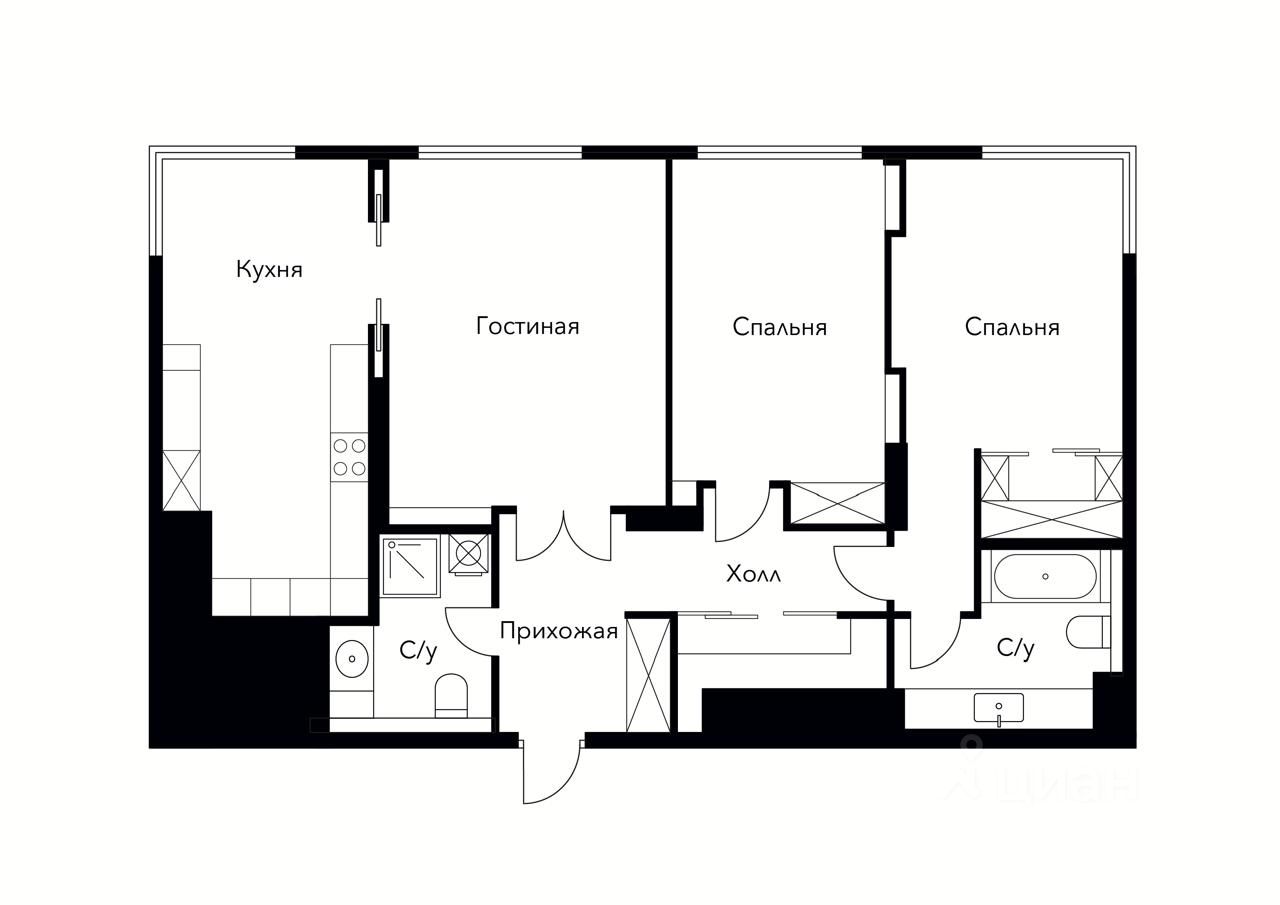 Планировка квартиры включает в себя : мастер спальню с гардеробной и ванной комнатой, детскую, зону кухни-гостиной. Гостевой санузел.