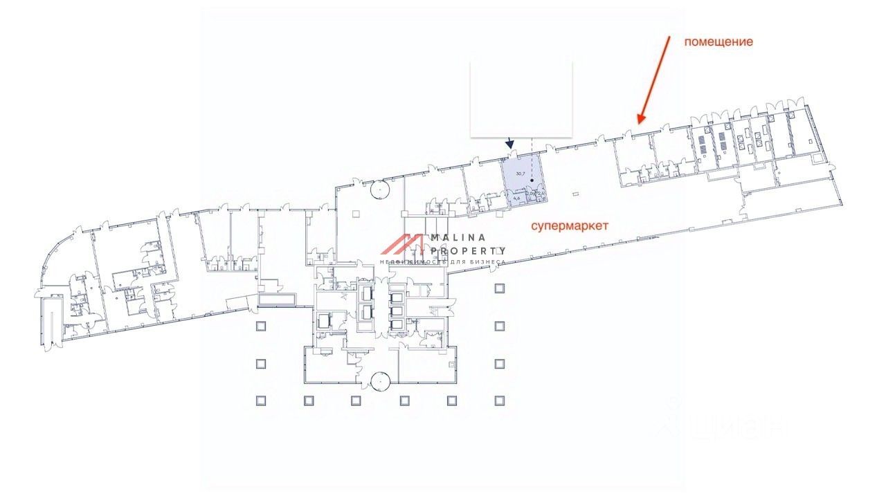 Ограниченное количество небольших площадей в комплексе. В соседнем помещении будет расположен единственный супермаркет.