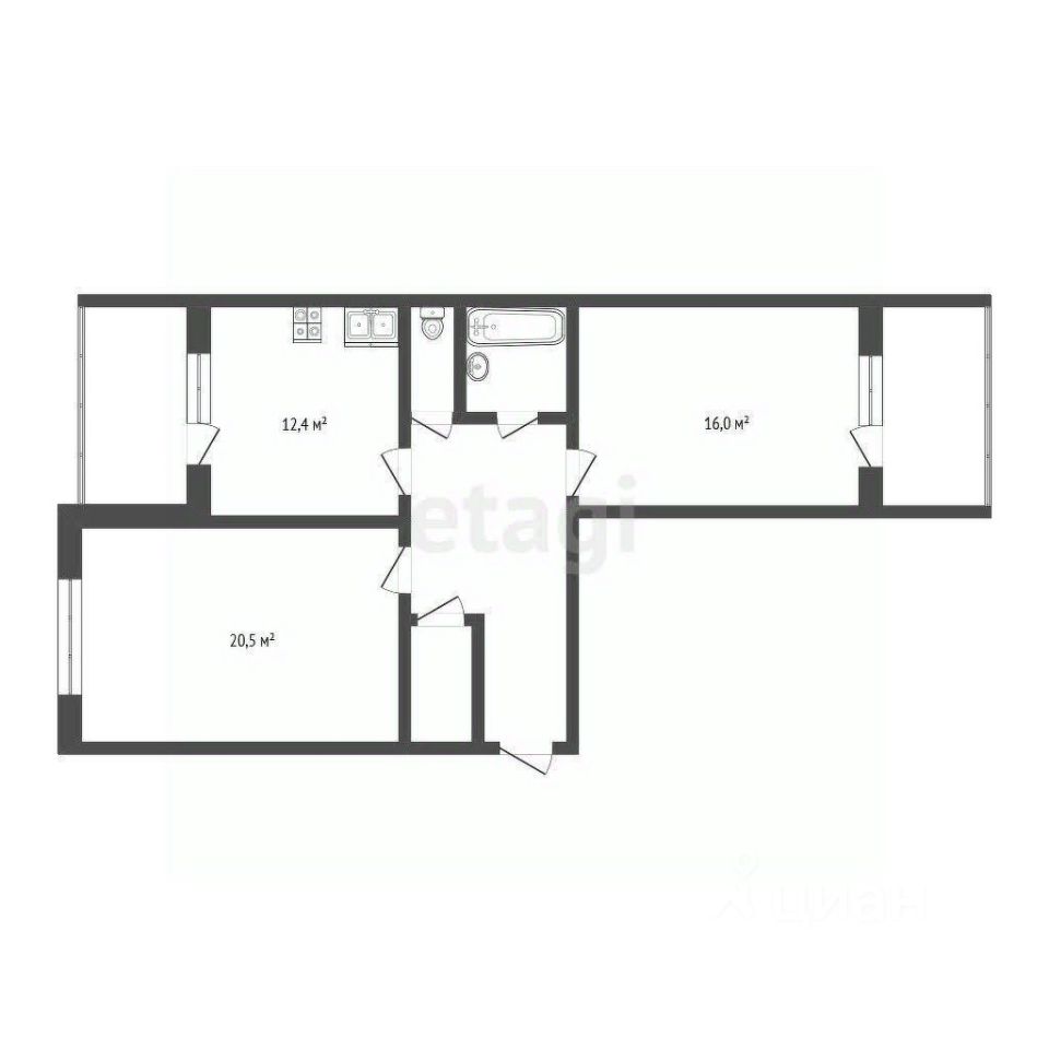 В квартире выполнен косметический ремонт. Просторная кухня 12.4 кв.м с выходом на застекленный балкон 3,2 м2. Две распашные комнаты 20 кв.м и 16кв.м.