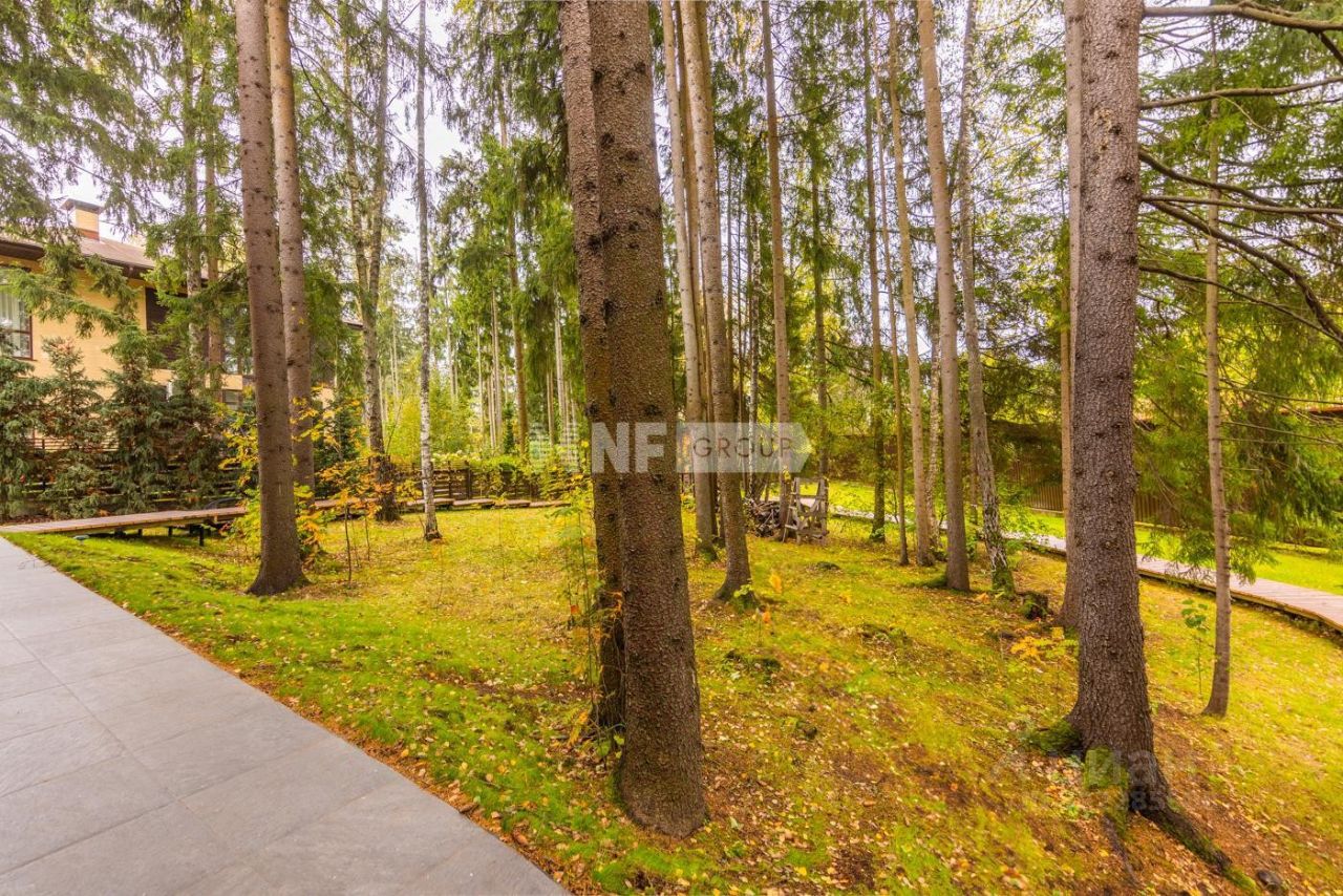 Участок с лесными деревьями преимущественно елями. По участку сделан дренаж, сеть дорожек.