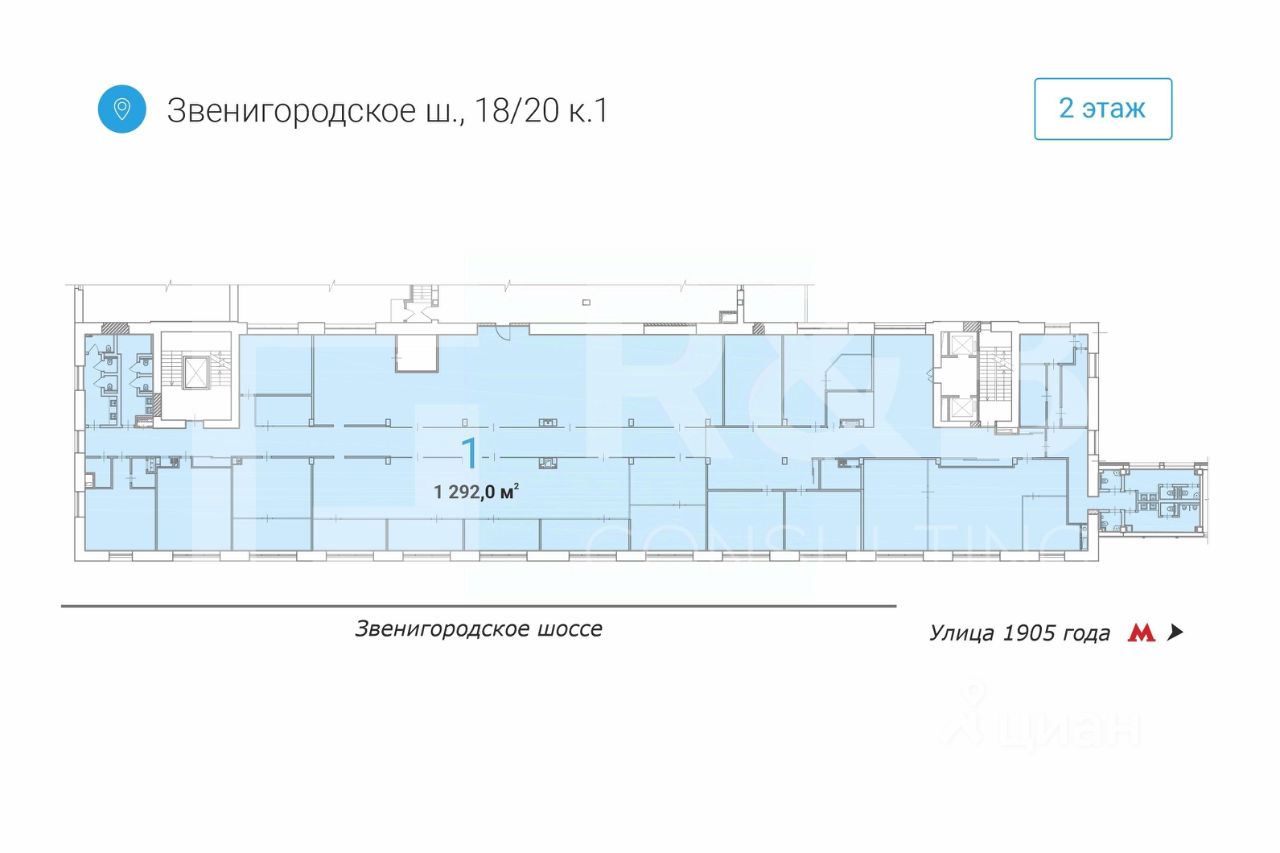 Аренда офиса 1292 кв. м в бизнес-центре ''Звенигородский'' (класс B+). Этаж: 2. Отделка - с отделкой Тип планировки - open-space. Вход - общий с улицы Помещение - свободно с 15.02.2026.