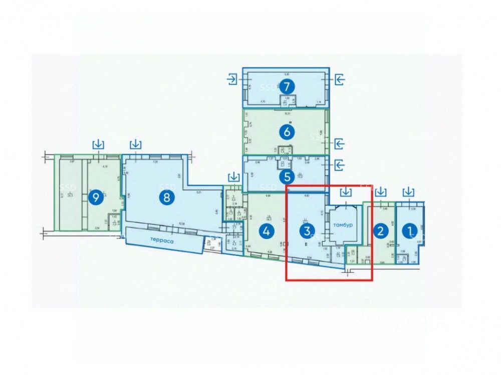 Общая площадь - 45,3 м². 15 кВт. Отдельный вход. Свободная планировка. Мокрая точка. Без отделки. Высота потолков 4 м.