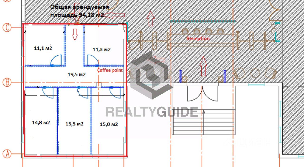 13 15 рабочих мест Светлые просторные помещения с современными инженерными системами, качественным ремонтом. Высокие потолки, обилие естественного освещения. Очень светлый блок с большим количеством окон (окна открываются) 94,18 м2 планировки со своей зоной coffee-point, санузлы на этаже.