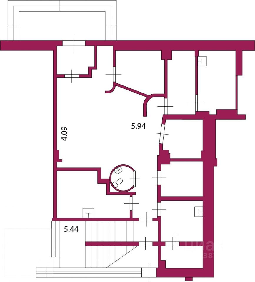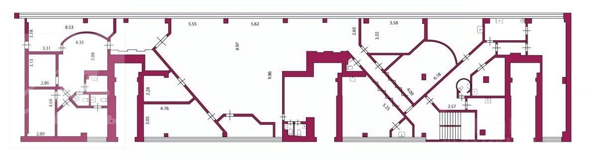 Общая площадь продаваемого помещения 586,1 кв. м. Витражные окна. Два входа в помещение: с улицы и со двора. Помещение было оборудовано под стоматологическую клинику, есть специализированные комнаты для рентгена и т.п., сейчас необходимые коммуникации ''заглушены'', но могут быть легко восстановлены как под стоматологию, так и под любую другую клинику. В данный момент помещение используется как офис. Большое количество ''мокрых точек''. Высота потолков 3,65 м.