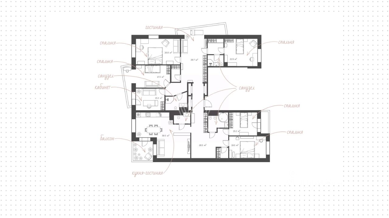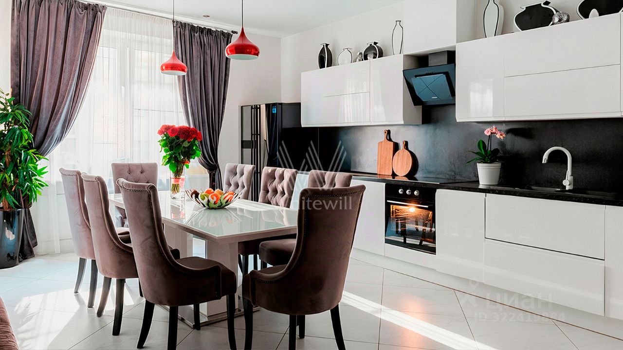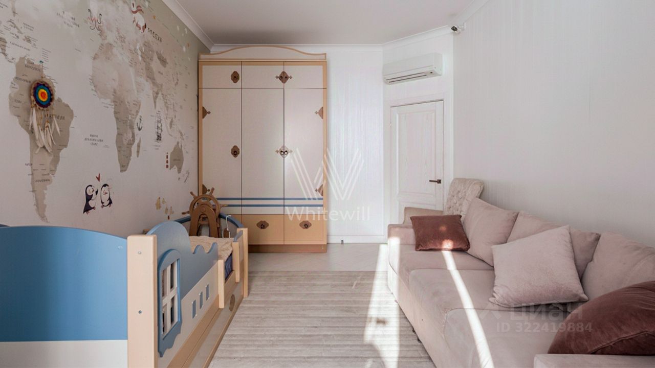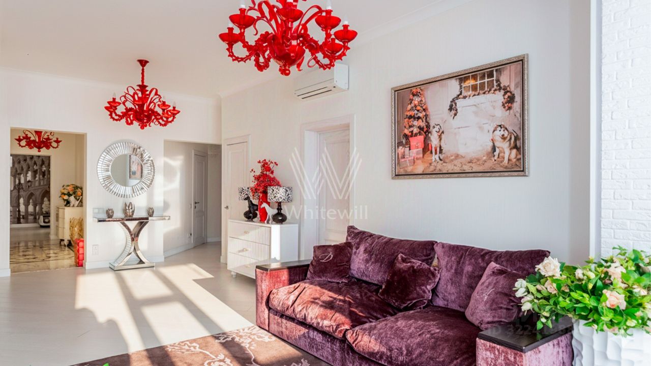 Продуманы различные сценарии освещения — дизайнерские люстры, настенные светильники и споты. Функциональная планировка включает кухню-гостиную с обеденной зоной, вторую гостиную, пять спален, кабинет, санузлы, гардеробные, три балкона, холл. Окна ориентированы на три стороны света, открываются виды на благоустроенную территорию комплекса и тихий переулок.