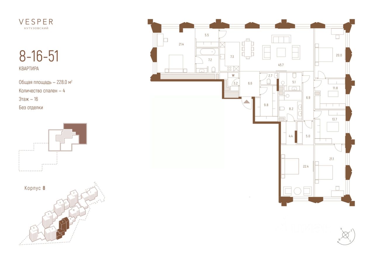 Продается 4-комнатная квартира с отделкой в корпусе 8.2 общей площадью 228 кв.м. на 16 этаже.