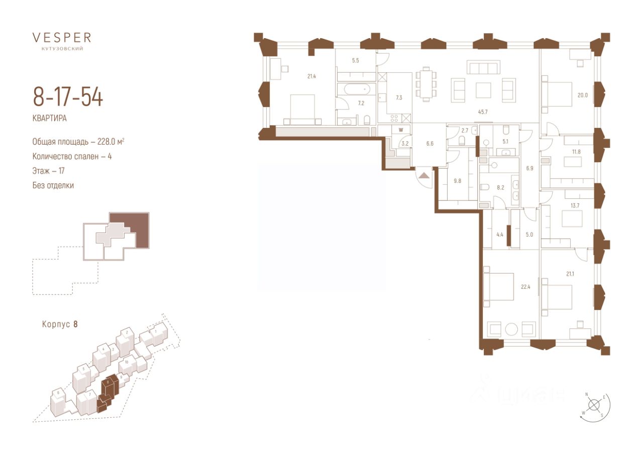 Продается квартира 4-спальнями без отделки, в корпусе 8.2 общей площадью 228 кв.м. на 17 этаже.