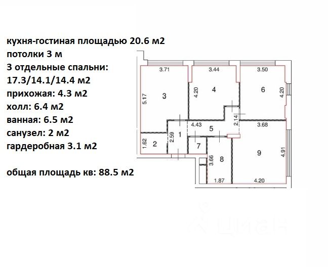 Характеристики квартиры: - большая кухня-гостиная площадью 20.6 м2 - потолки 3 м - 3 отдельные спальни: 17.3/14.1/14.4 м2 - прихожая: 4.3 м2 - холл: 6.4 м2 - ванная: 6.5 м2 - санузел: 2 м2 - гардеробная 3.