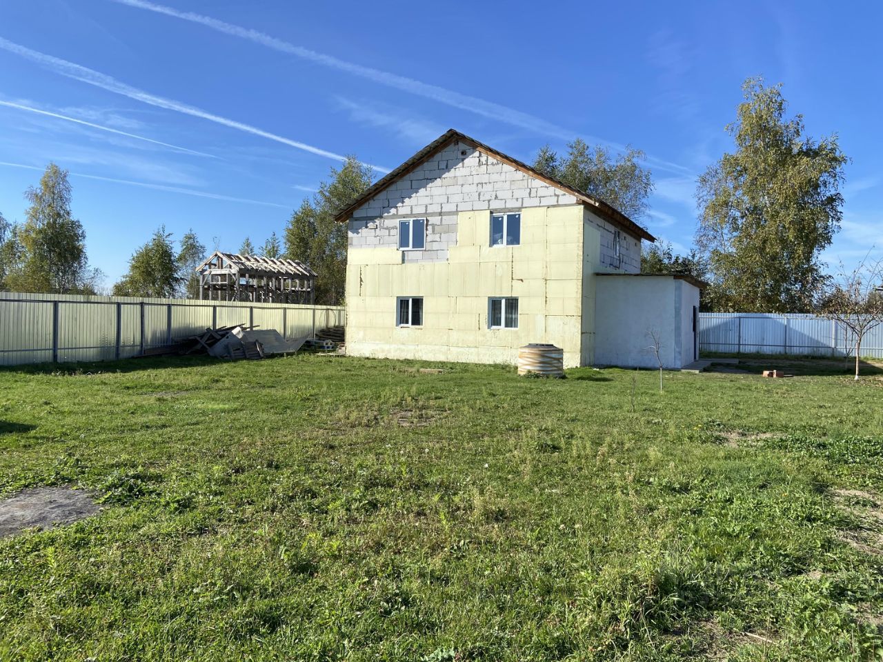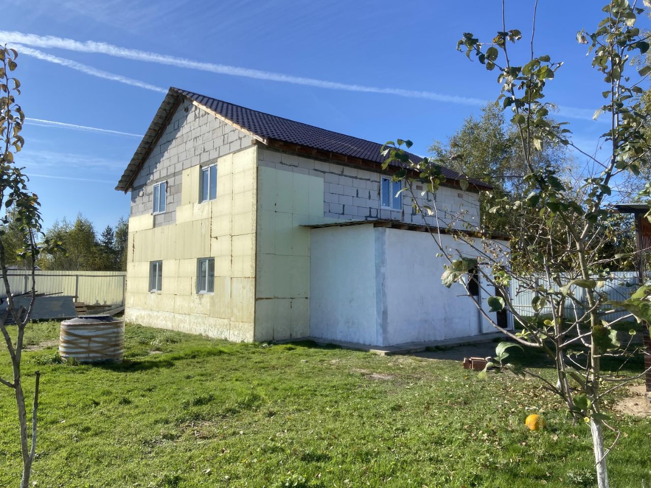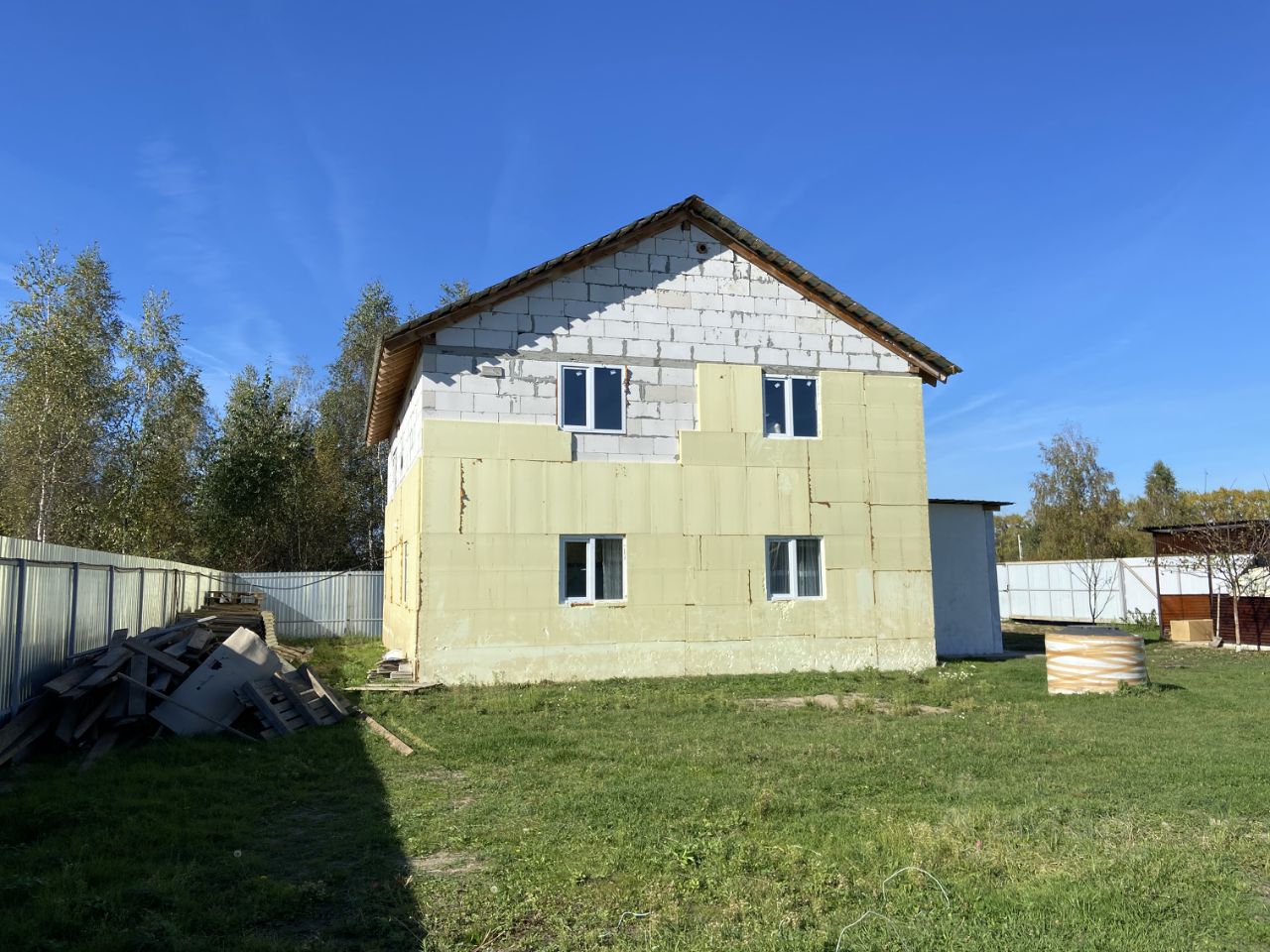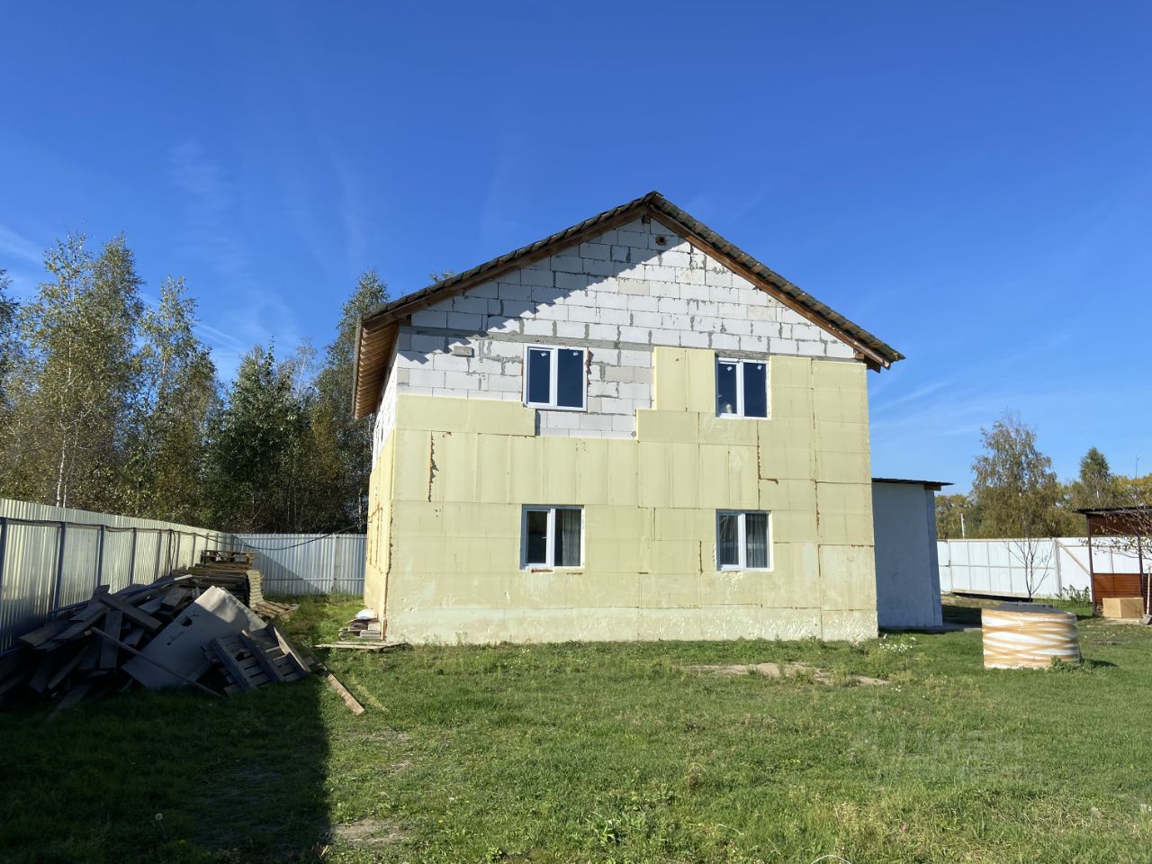Фундамент ленточный 1,2м. в земле, стены газоблок + утеплитель, перекрытия деревянные 150 на 200, Свет 15кВТ, колодец 10 колец - вода хорошего качества, септик переливные кольца, котел на 150л. Крыша металлочерепица.