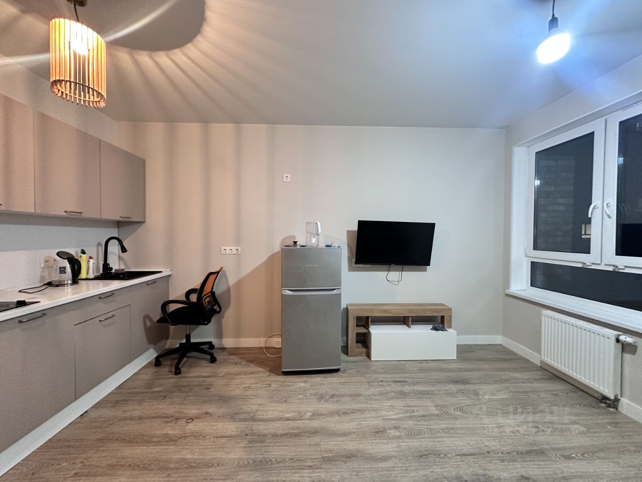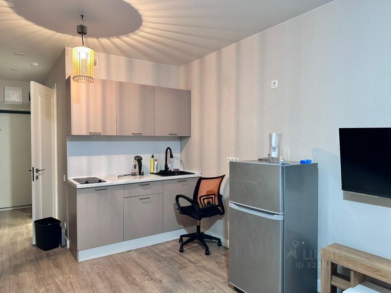 В апартаментах сделан евроремонт, все продумано до мелочей. Комната с кухней обставлена необходимой мебелью, есть все для комфортного приготовления и проживания. Из техники в вашем распоряжении холодильник, варочная панель, стиральная машина и телевизор. Санузел совмещенный, оборудован современной душевой кабиной.