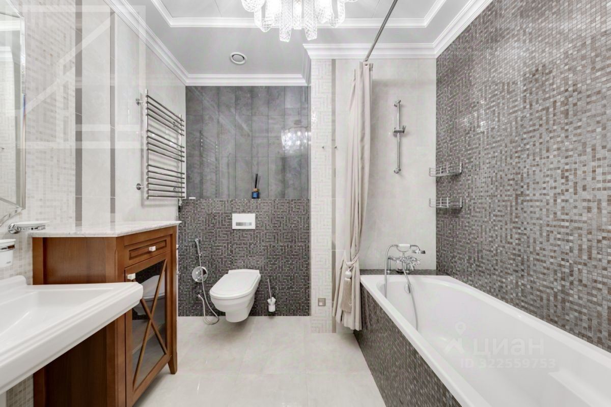 Планировка: просторная гостиная с обеденной и мягкой зоной, кухня, мастер-спальня с ванной и гардеробной комнатой, спальня, кабинет с гардеробной, ванная комната, гардеробная, постирочная. Потолки 3,4м. Выполнен дизайнерский ремонт с использованием натурального мрамора и ценных пород дерева. Интерьер оформлен в лаконичных светлых тонах. Квартира полностью укомплектована дизайнерской мебелью.