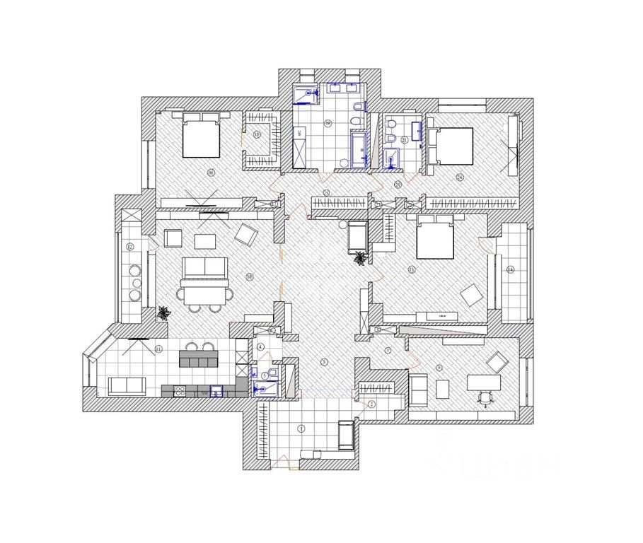 ID: 8226. ЭКСКЛЮЗИВ! Просторная, светлая квартира в клубном доме на 19 квартира в Хамовниках. Отделка премиум уровня. Использованы натуральные отделочные материалы. Встроенная кухня Scavolini, бытовая техника Kuppersbusch. Окна на 3 стороны света. В квартире 4 спальни, 3 ванные комнаты, 2 лоджии. Планировочным решением предусмотрены: гостиная с лоджией, кухня-столовая, мастер-спальня с камином, лоджией и ванной комнатой, 3 спальни, 2 ванные комнаты, гардеробная, постирочная. Предусмотрено машиноместо. Малоквартирный дом с закрытой территорией. Круглосуточная охрана, собственная служба эксплуатации, видеонаблюдение, подземный паркинг. Есть места для хранения велосипедов и колясок. В доме фитнес-зал, бассейн, хамам, сауна. Оборудовано бомбоубежище.