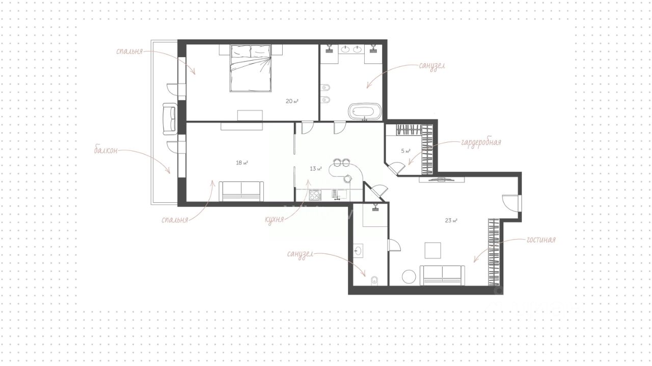 Функциональная планировка включает гостиную с проектором, кухню, две спальни с выходом на просторный балкон, ванную комнату, гостевой санузел с душевой, гардеробную. Благодаря панорамному остеклению пространство наполнено естественным светом и теплом.