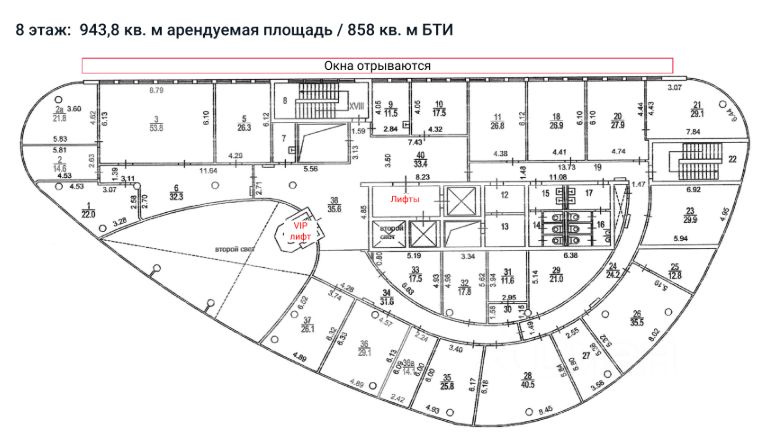 Офисные блоки на 3, 4 и 8 этажах с возможностью разделения. Каждый этаж имеет качественную отделку, высоту потолков 3,5 м и передается в состоянии после выезда предыдущего арендатора. По запросу возможно предоставление мебели.