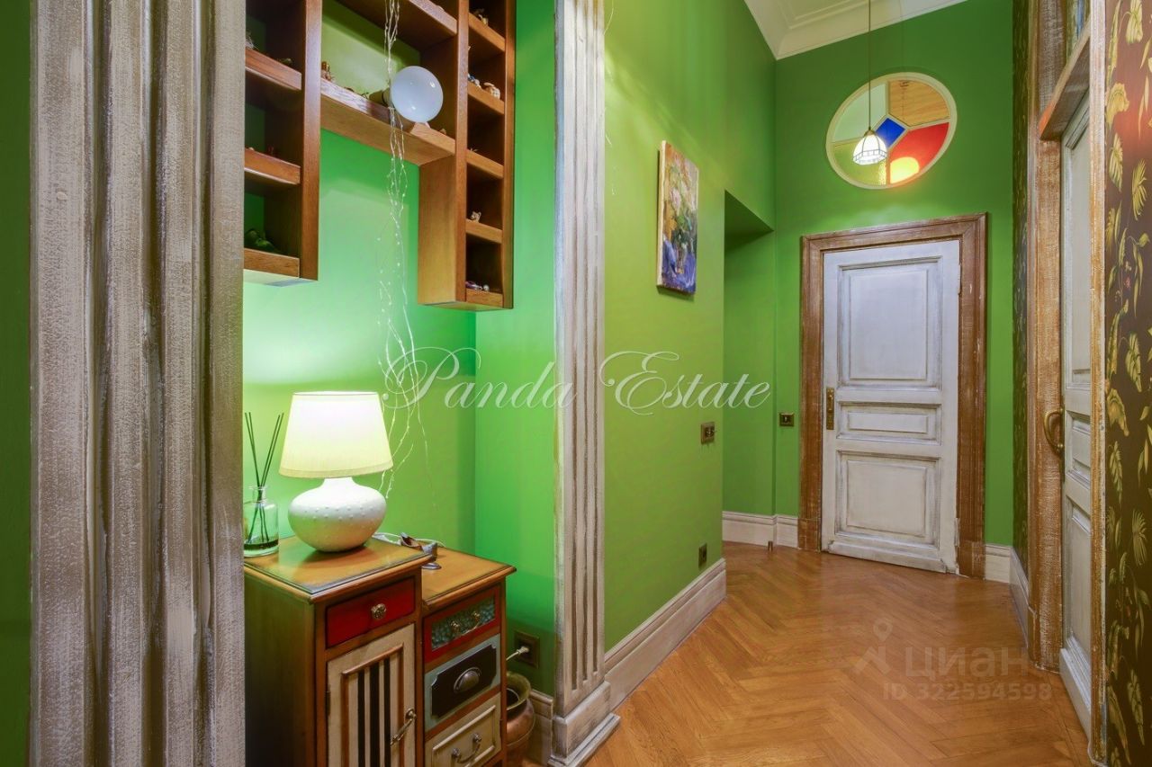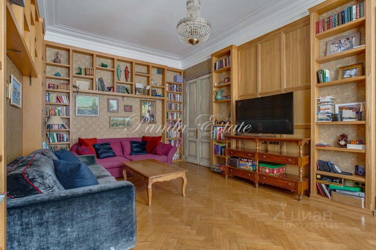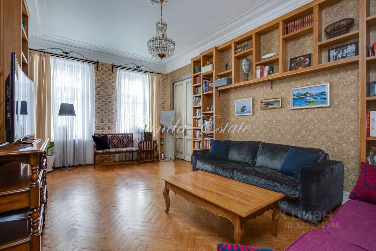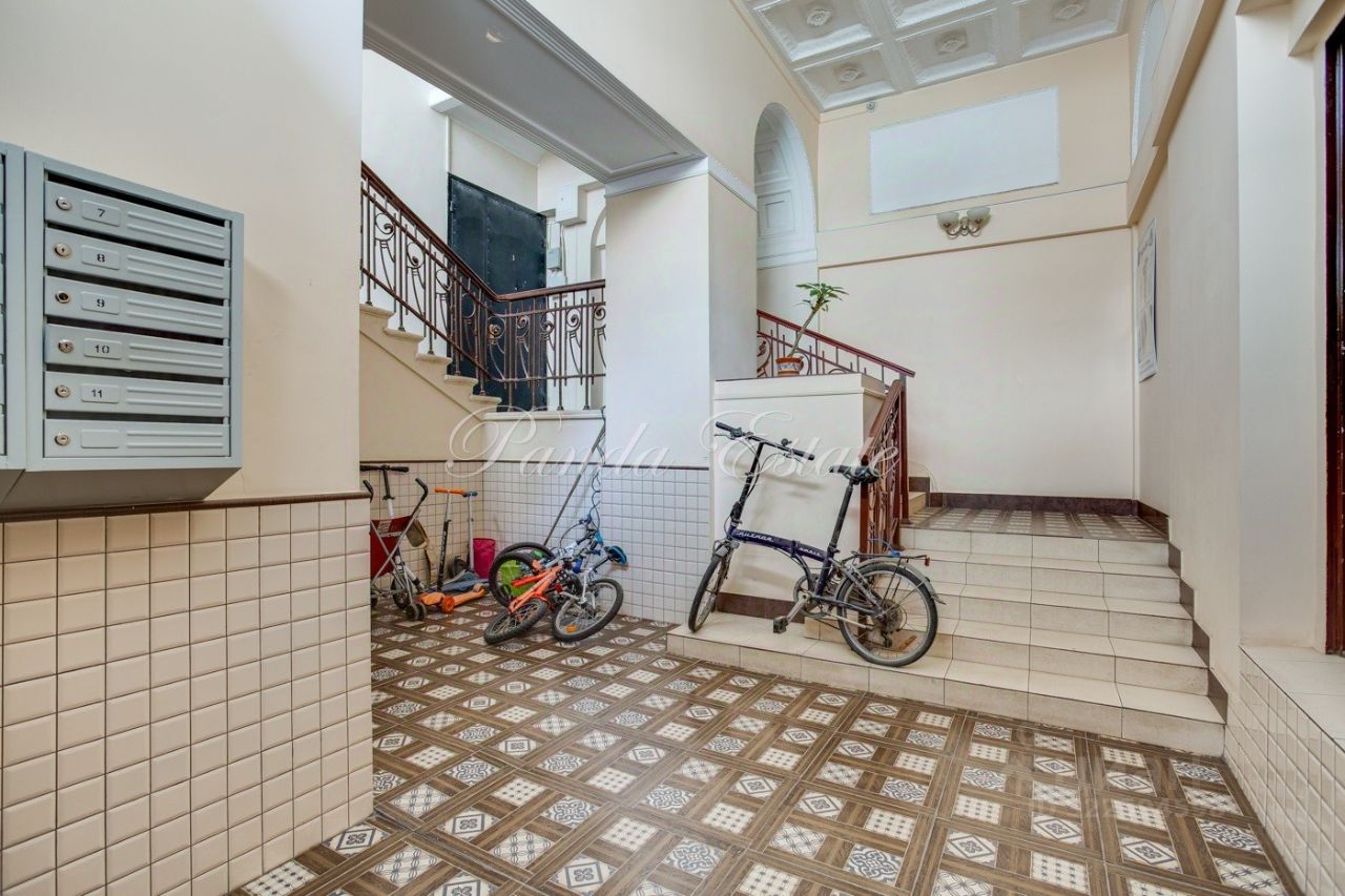 Уютная квартира с 3 спальнями. Планировка: прихожая с гардеробной комнатой, большая гостиная, спальня, гостевой санузел, кухня, санузел, спальня, гардеробная комната, спальня. Высокие потолки 3,5 метра, сохранен дореволюционный паркет, отреставрирован. Сохранена оригинальная лепнина.
