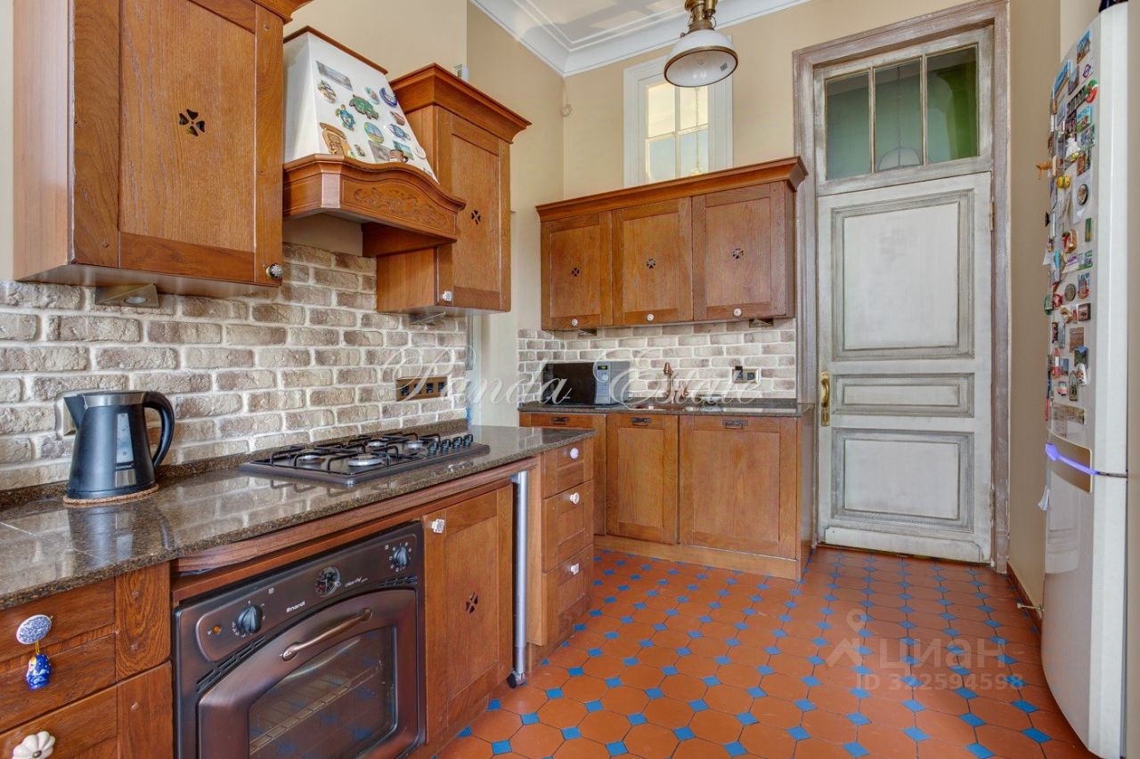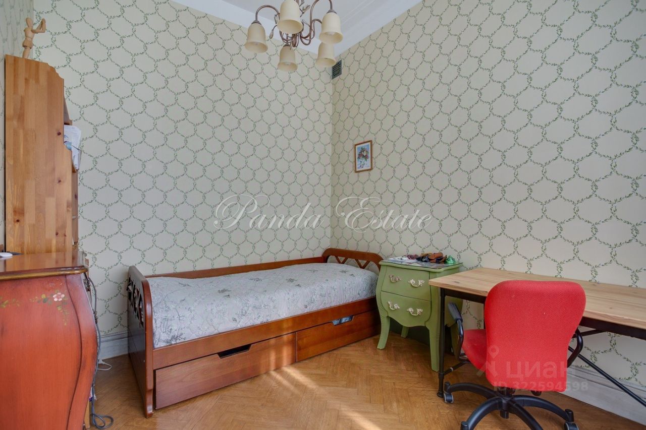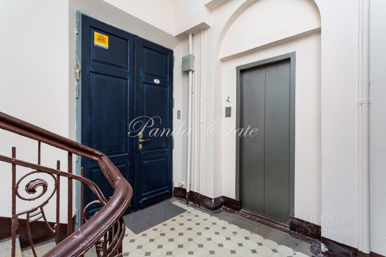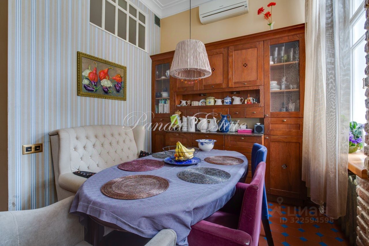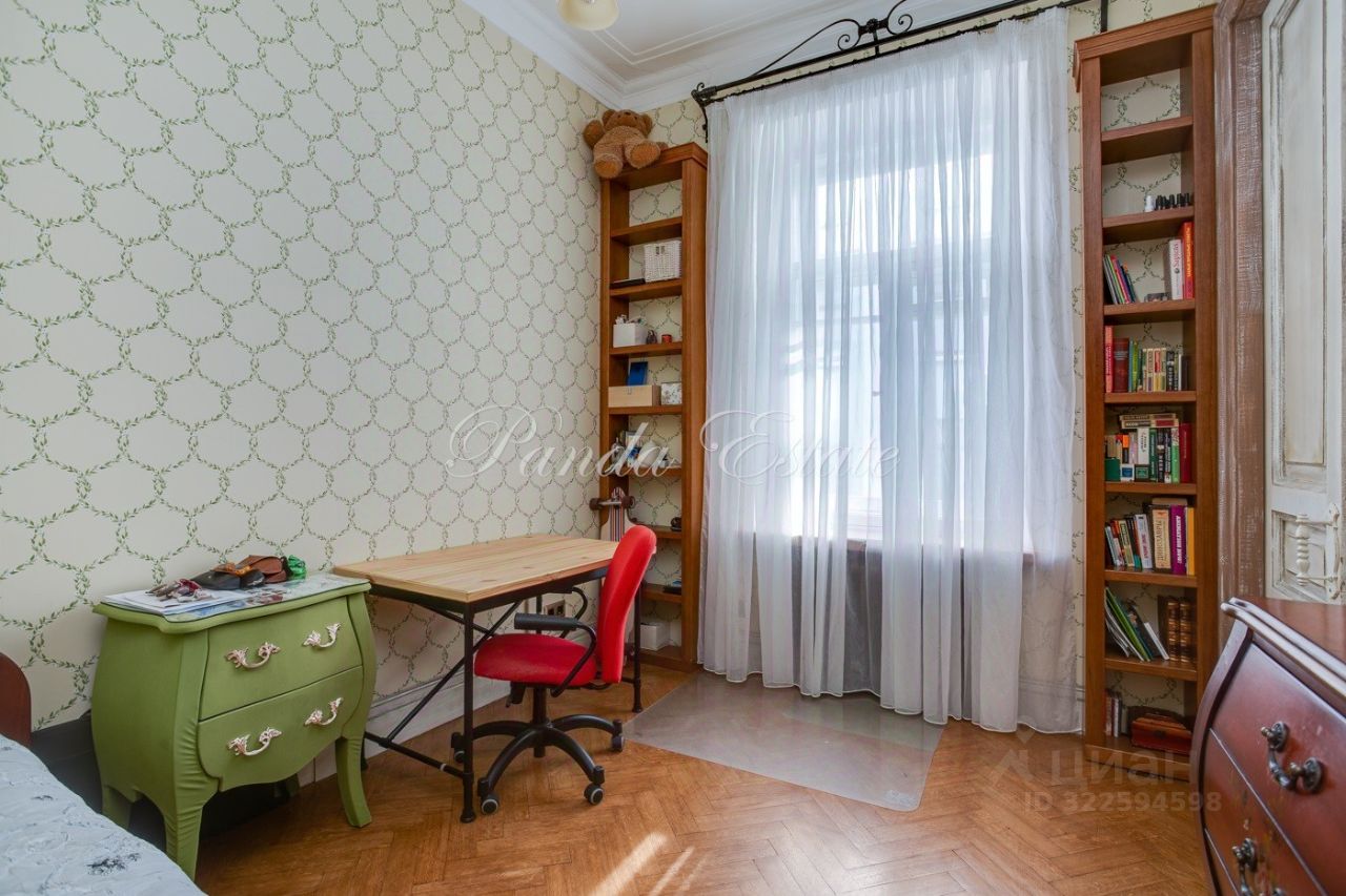 Уютная квартира с 3 спальнями. Планировка: прихожая с гардеробной комнатой, большая гостиная, спальня, гостевой санузел, кухня, санузел, спальня, гардеробная комната, спальня. Высокие потолки 3,5 метра, сохранен дореволюционный паркет, отреставрирован. Сохранена оригинальная лепнина.