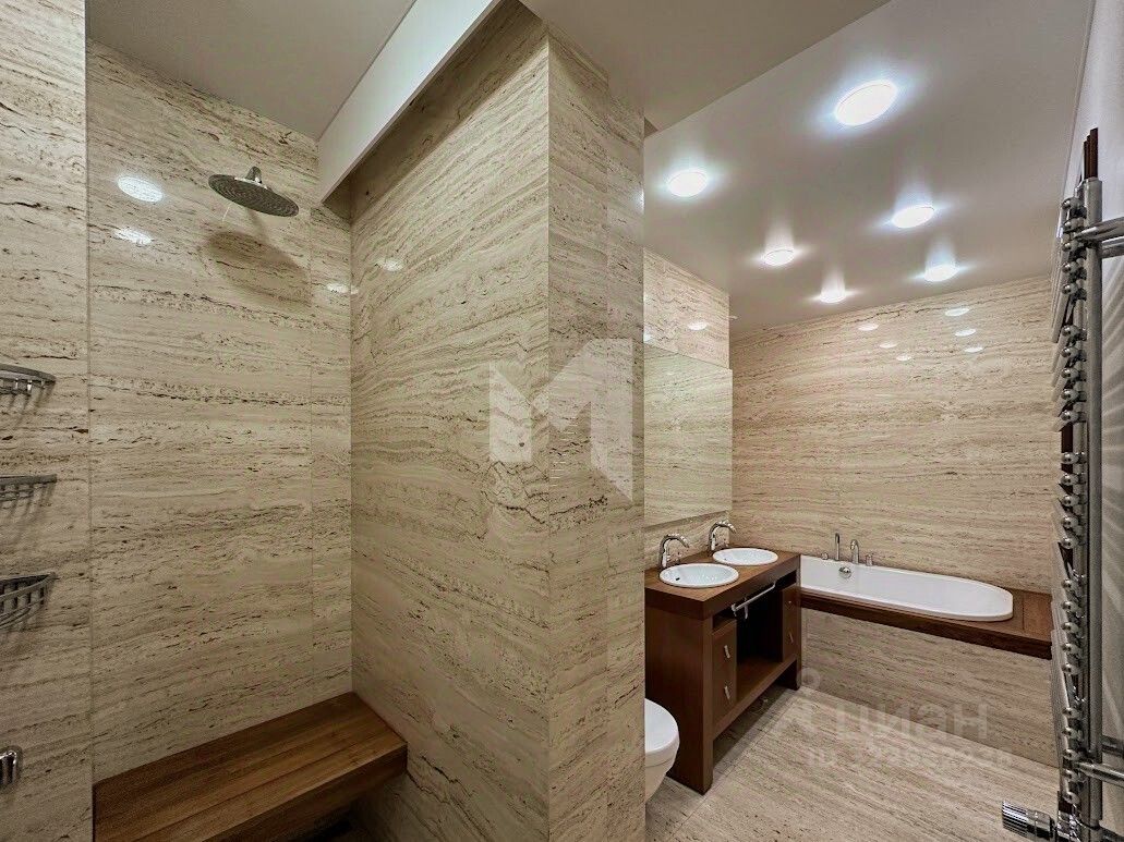 Интерьеры оформлены в современном стиле, с использованием импортных материалов. Квартира частично меблирована. Установлена система кондиционирования и вентиляции воздуха, очистка воды и т.д.