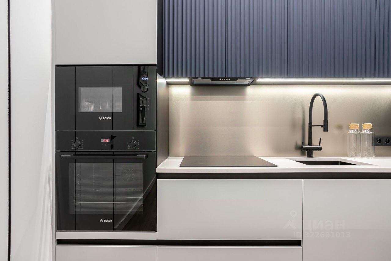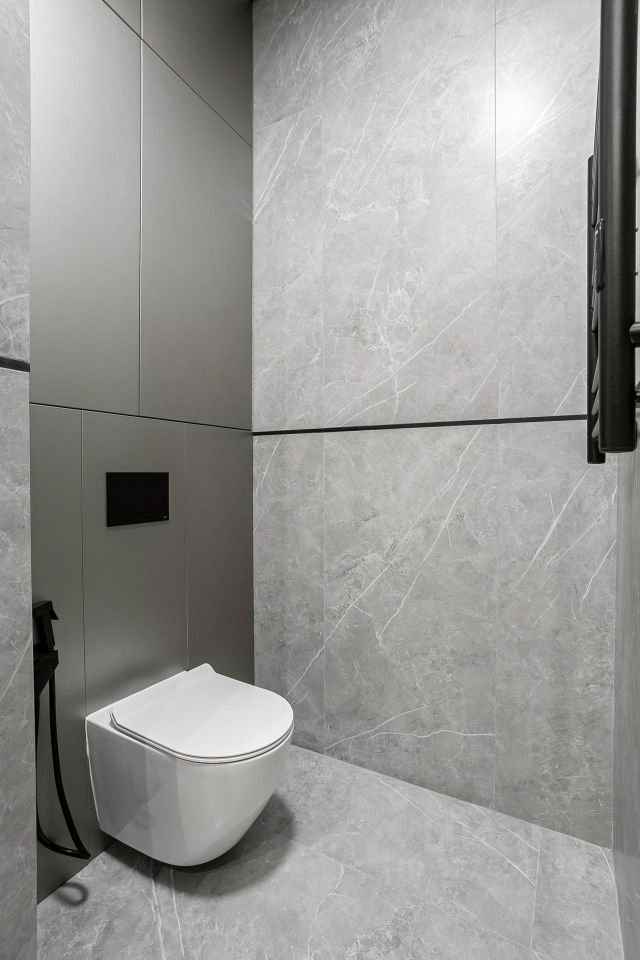 Кухня укомплектована техникой Bosch. Стиральная и сушильная машины Krting, сантехника Gеsenberg. В санузлах — крупноформатный керамогранит в серых оттенках с акцентным цветом дерева.