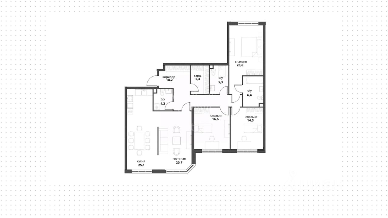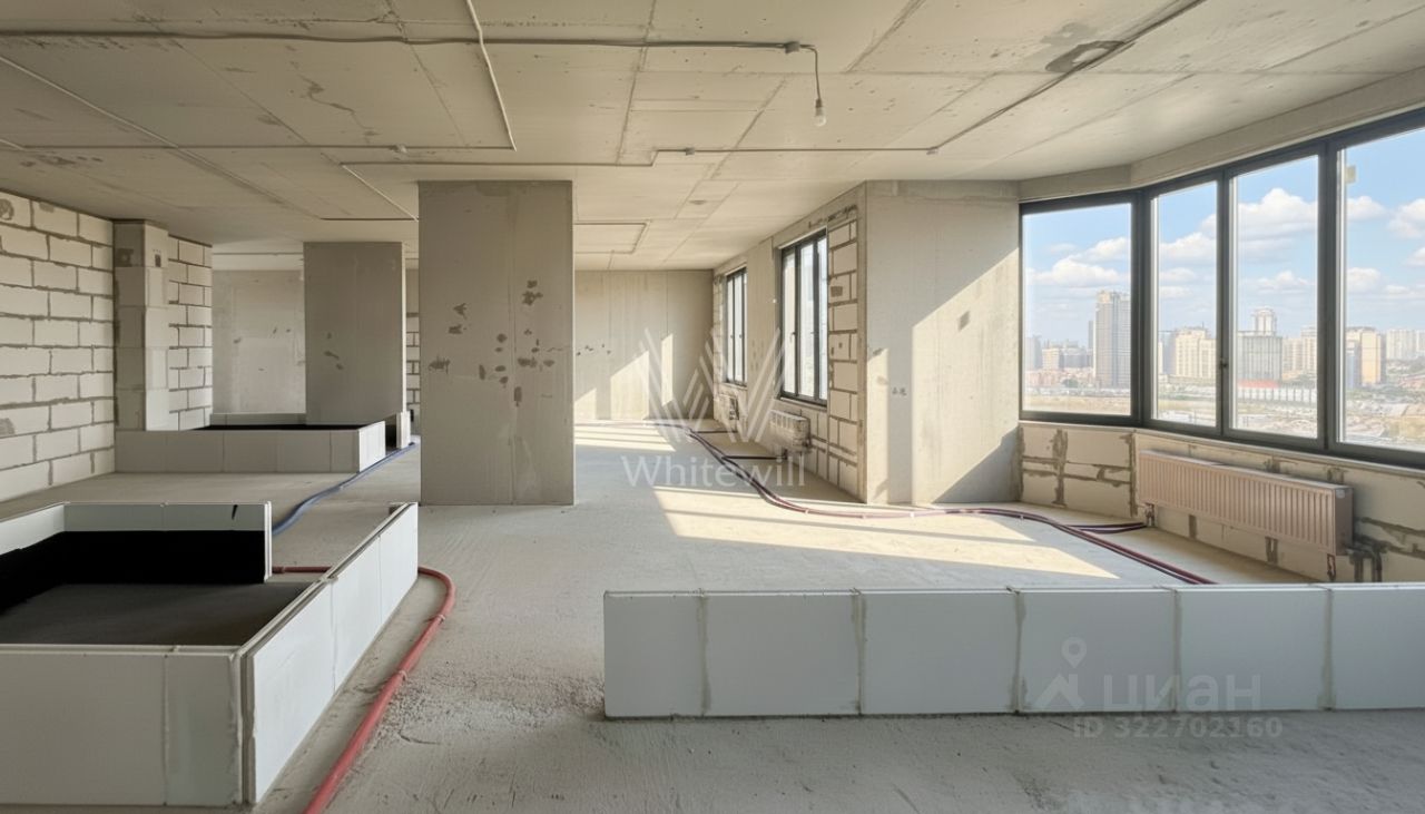 Квартира без отделки площадью 137 м² Планировка включает кухню-гостиную, мастер-спальню с собственной ванной комнатой, две изолированные спальни, два санузла, гардеробную и холл. Высота потолков 3,1 м. Окна ориентированы на две стороны света, из четырёх окон открываются панорамные виды на парк ''Событие''. Ключи получены. Есть машино-место в поземном паркинге и кладовка.
