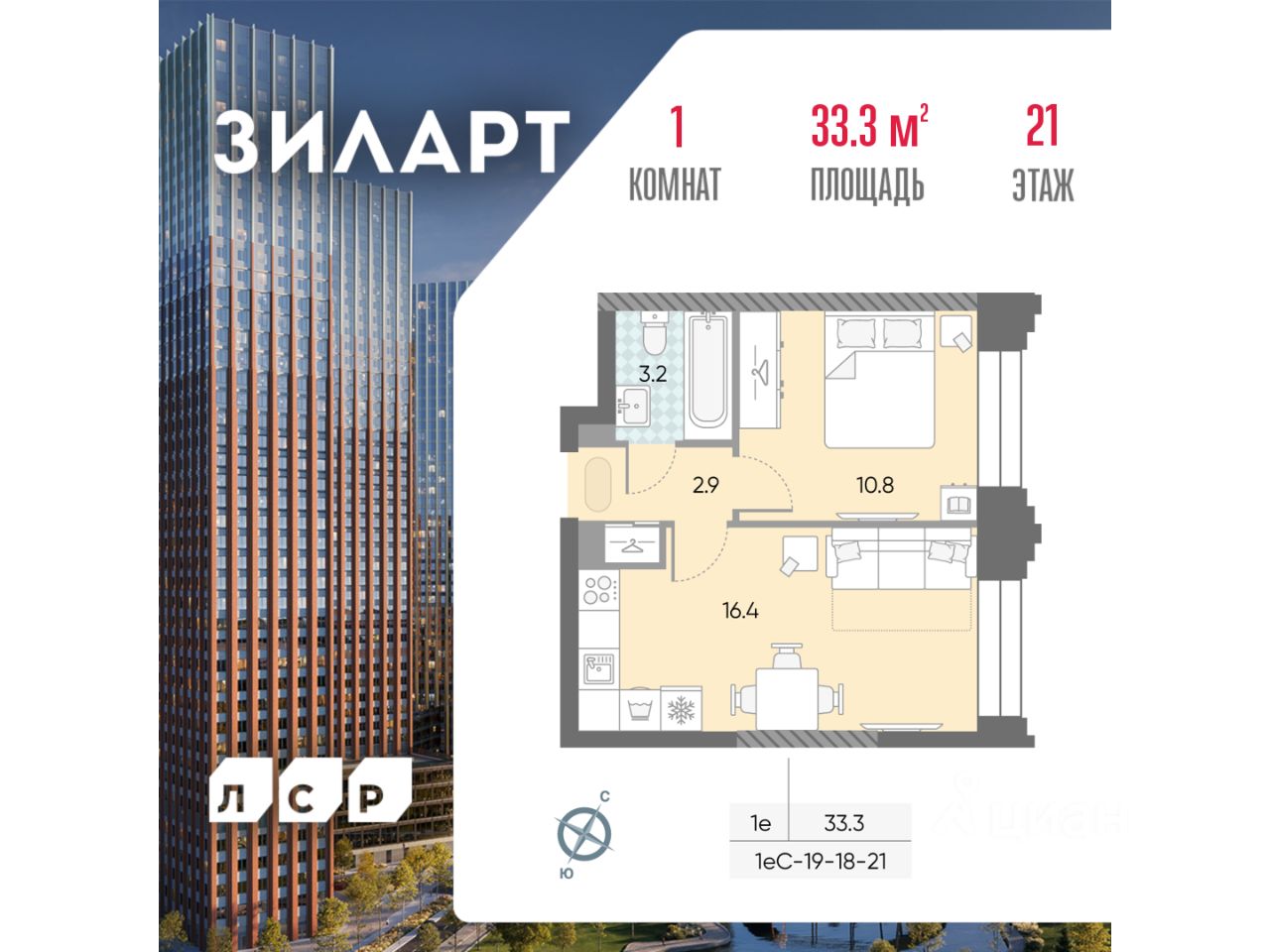 Продаётся 1-комнатная квартира в доме ЗИЛАРТ СПАРК общей площадью 33.3 кв. метров на 21 этаже.