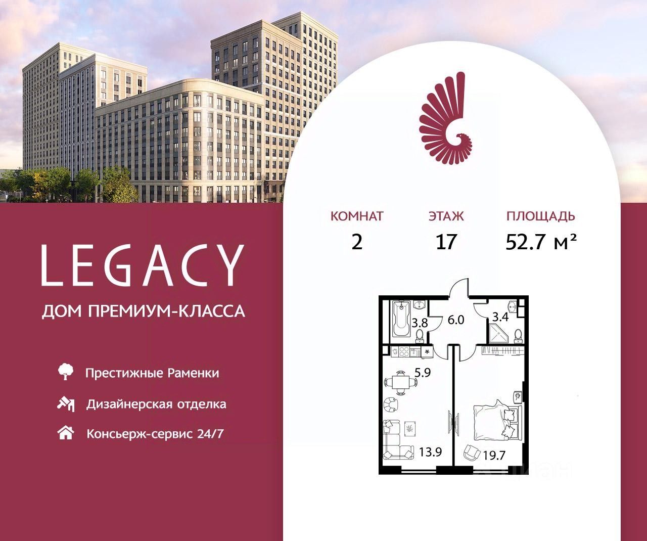 Продается двухкомнатная квартира общей площадью 50,4 м2 на 3 этаже дома премиум-класса Legacy в районе Раменки.
