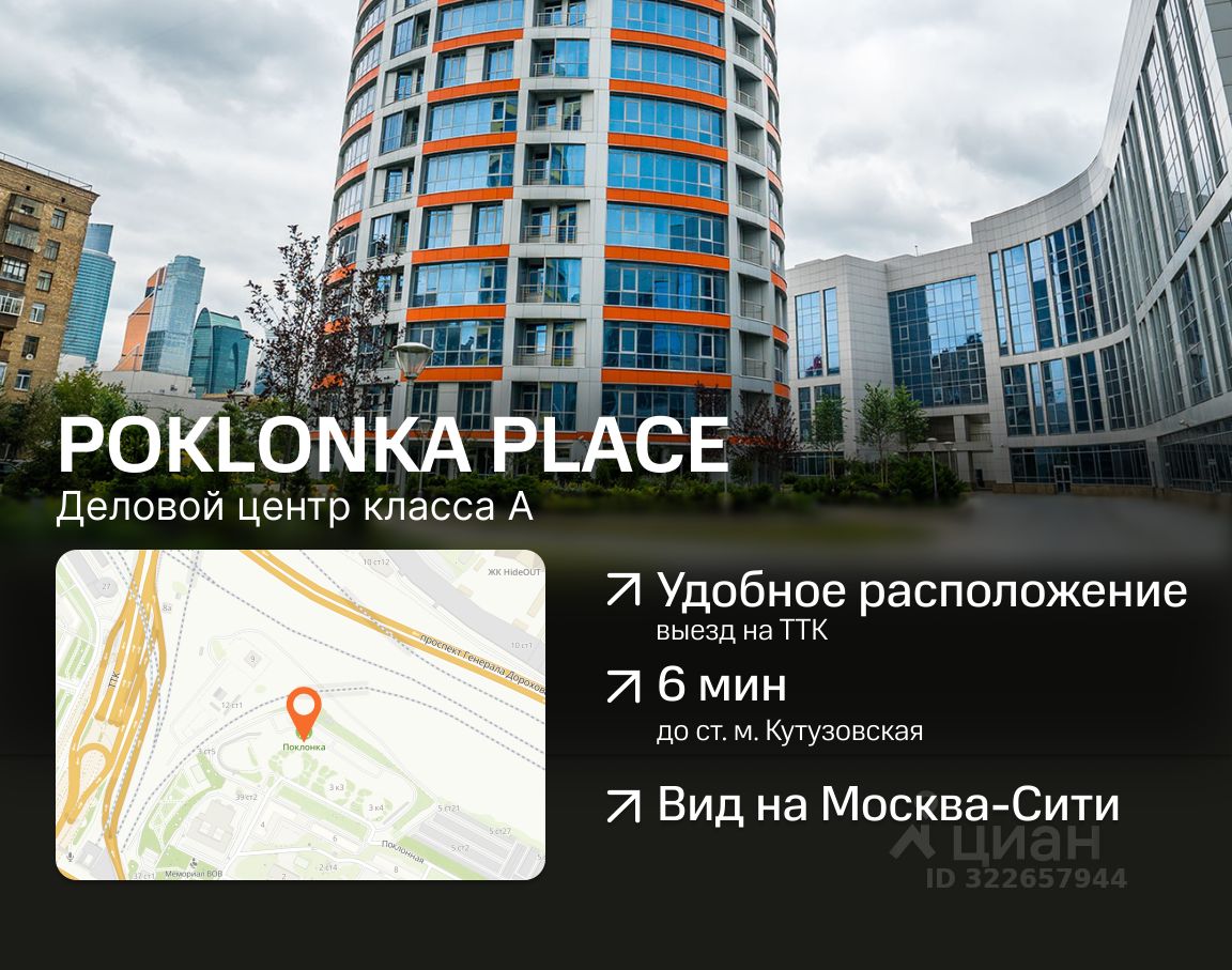 ПРЕИМУЩЕСТВА: • шаговая доступность от станций метро Кутузовская и Парк Победы, а также станции Поклонная (МЦД-4). Удобный съезд с ТТК — до БЦ очень легко добраться, • БЦ Поклонка окружен собственной парковой территорией с ландшафтным дизайном. Здесь растут порядка 300 деревьев хвойных и лиственных пород.