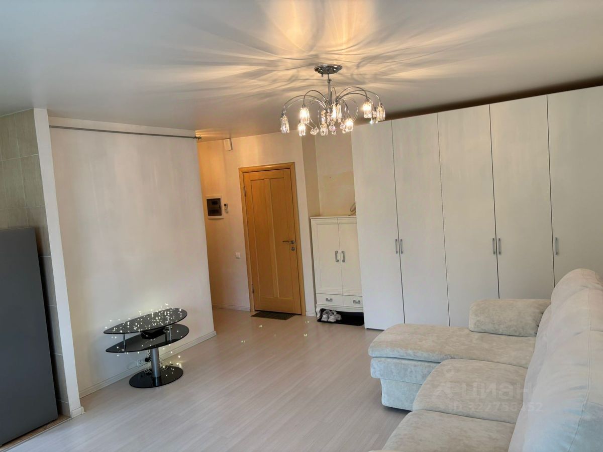 Просторная квартира включает в себя гостиную со спальным местом и рабочей зоной у окна, кухню и санузел с душевой кабиной, а также светлый застекленный балкон с видом во двор.