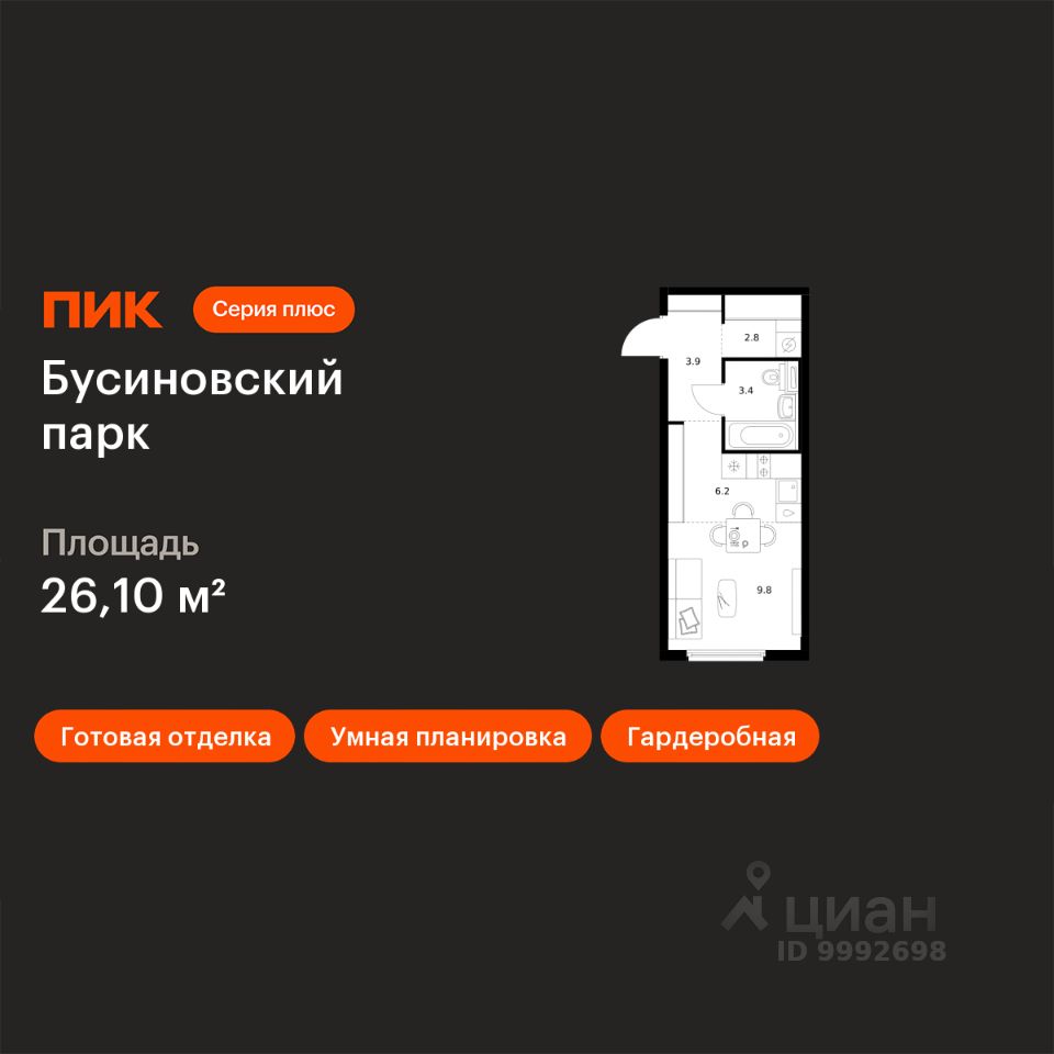 Продаётся квартира-студия площадью 26,1 кв.м на 20 этаже 24 этажного дома (Корпус 22.4, Секция 4) проекта ПИК Бусиновский парк. Светлый просторный подъезд на уровне земли, функциональная планировка, большие окна, c отделкой.