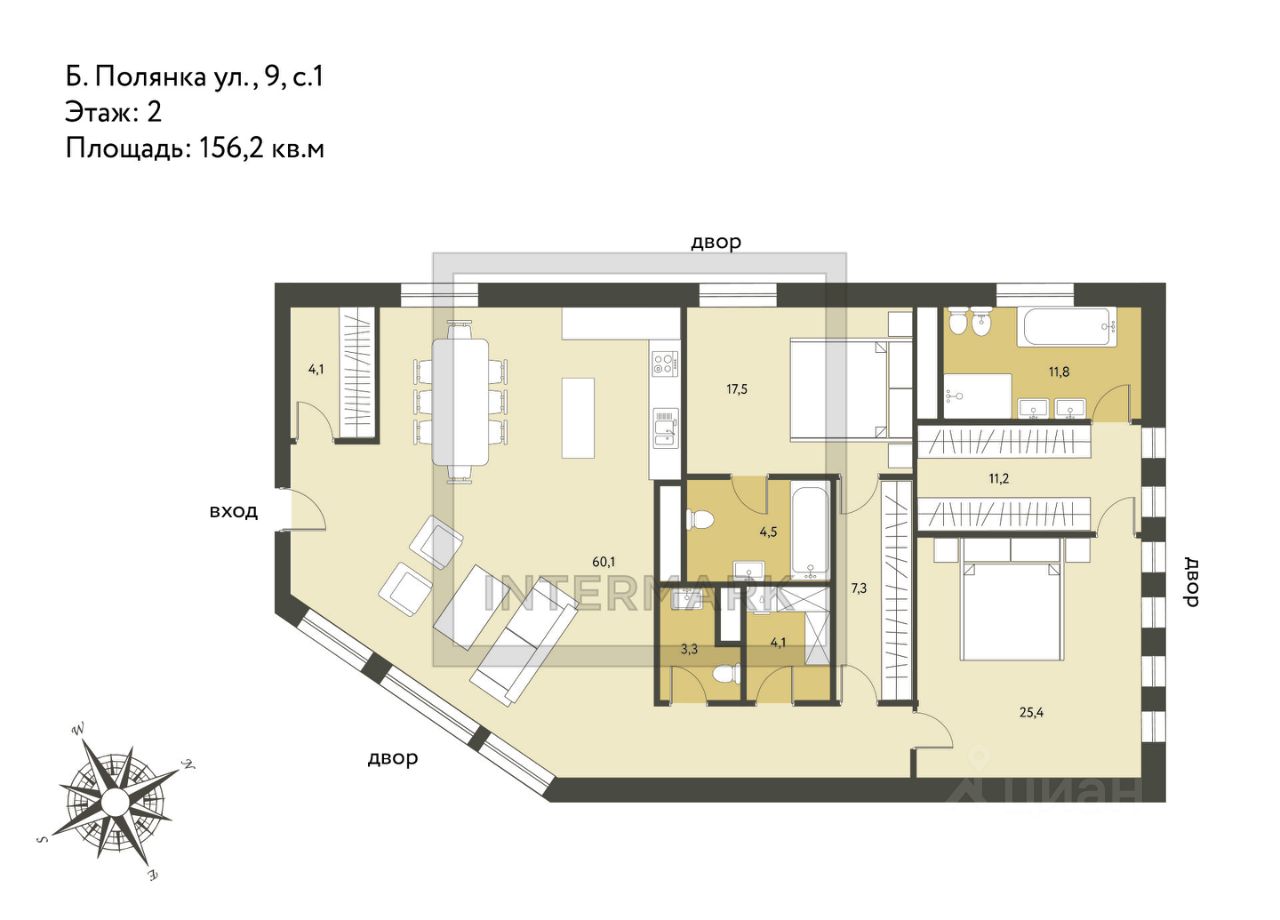 ID 64993. В премиальном клубном комплексе Cloud 9 на продажу предлагается уникальная трехкомнатная квартира. Площадь 156,2 кв.м. грамотно зонирована на гостевую и приватную части. В передней части квартиры расположены: гардеробная и просторная гостиная-кухня с ориентацией на две стороны света и огромными окнами, гостевой санузел. В приватной части master-bedroom c большой гардеробной и ванной с окном, постирочная, детская комната с ванной комнатной и гардеробной. Окна выходят на три стороны света в тихие уютные дворы, виды открытые. Высота потолка 3,146 м. Отделка выполнена в нейтральном стиле ''индустриальный эко-шик'' от дизайнерского бюро MASSIMO IOSA GHINI. Высококачественные натуральные материалы: на полу - дубовый паркет, в ванных комнатах - мрамор. Премиальные мировые бренды швейцарские окна Forster (Швейцария), бытовая техника Neff (Германия), сантехника Villeroy & Boсh (Германия). ЖК ''Cloud 9'' обладает уникальными техническими характеристиками современного жилья: система кондиционирования воздуха типа VRF (Veriable Refrigerant Volume), система принудительной приточно-вытяжной вентиляции с подготовкой и увлажнением воздуха, инновационная система очистки воздуха TION, онлайн мониторинг качества воздуха, многоуровневая система очистки воды, резервная система бесперебойного обеспечения горячей водой. Повышенная система безопасности - видеонаблюдение, охранная сигнализация по периметру дома, контроль доступа, огороженная охраняемая территория, круглосуточный консьерж. Подземный паркинг. ЖК ''Cloud 9'' находится в 2 км от Кремля по соседству от Третьяковской галереи. Также в пешей доступности расположены - парк Музеон, фитнес клубы ''Terra Sport Коперник'', ''World Class'' и ''Онегинъ'', три школы, два детских сада, супермаркеты ''Азбука Вкуса и ВкусВилл, станции метро Полянка и Третьяковская.