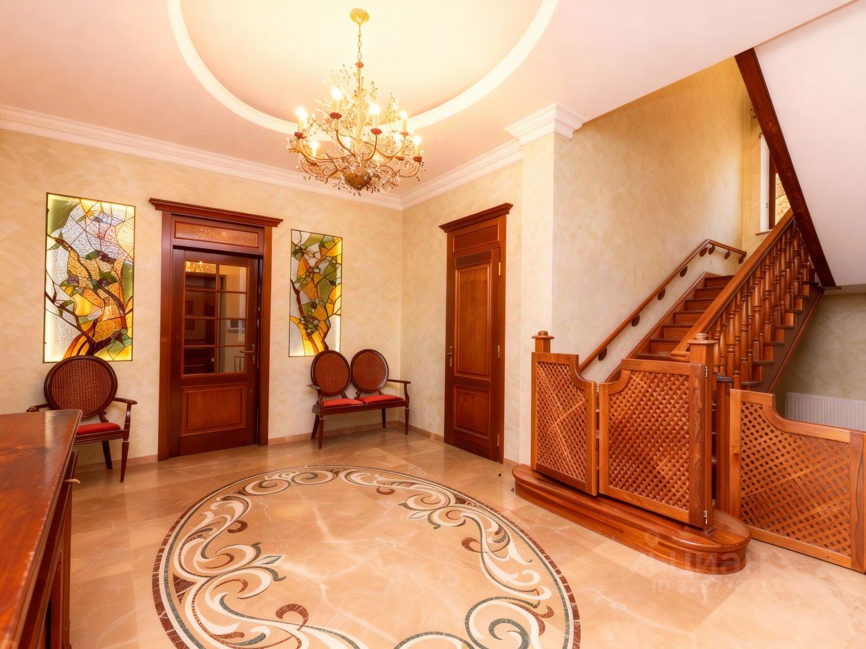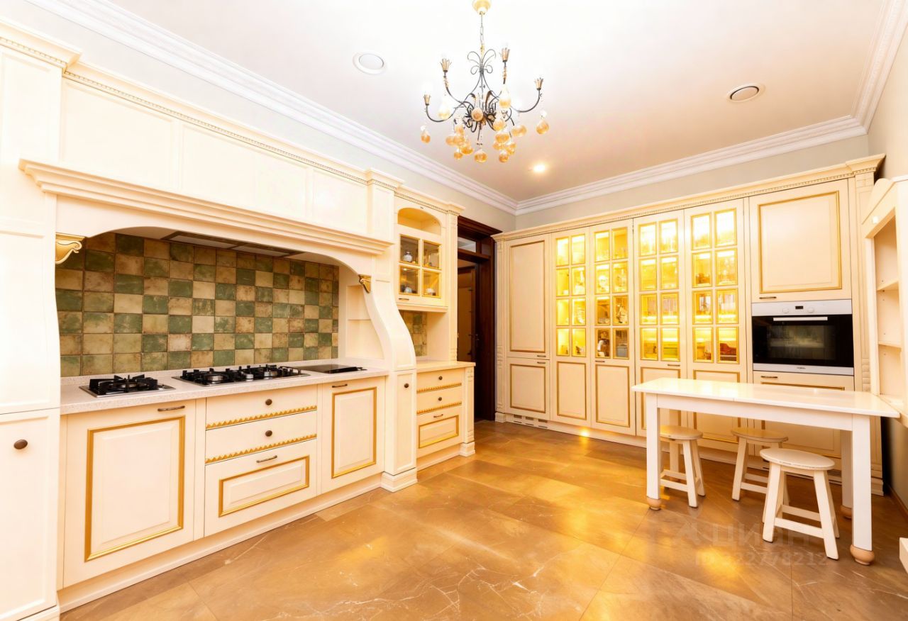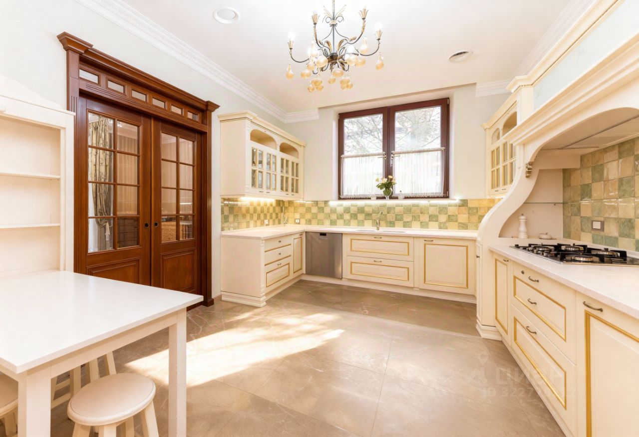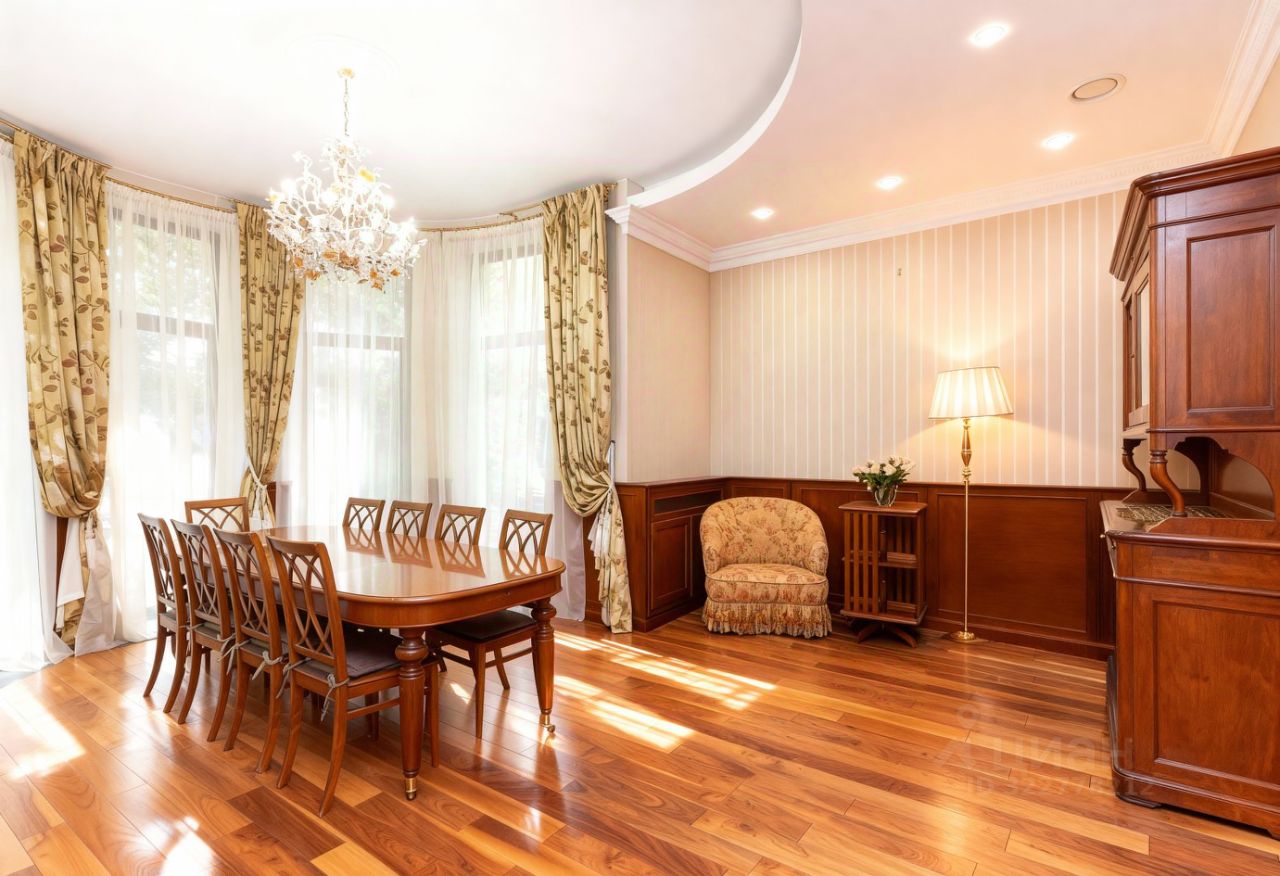 Преимущества: — Интерьер выполнен в классическом аутентичном стиле с эксклюзивной итальянской мебелью, — Панорамные окна и эркеры наполняют пространство обильным светом и теплом, — Гостиная и кухня-столовая формируют уютное пространство площадью 93 м², — Рациональная, продуманная планировка — идеальна для жизни с детьми, — На участке — полный комплекс зданий для по-настоящему комфортной загородной жизни.