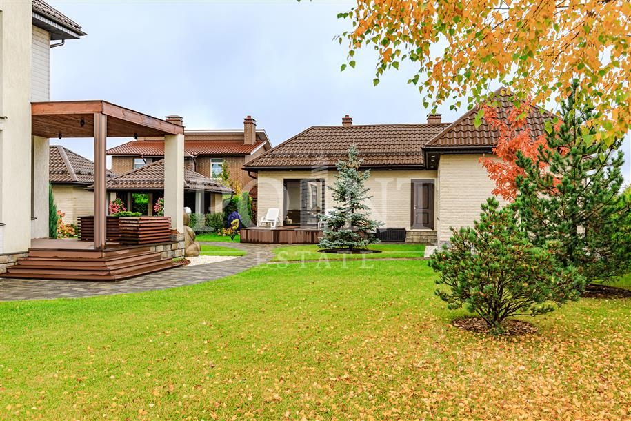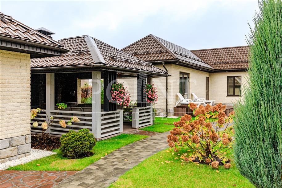 Лот: 104990. Загородный дом в три уровня расположен в охраняемом поселке ''Новорижский (Покровское)''. Дом наполнен естественным светом благодаря грамотной ориентации по сторонам света, высоким потолкам и панорамным окнам — в течение дня солнце заглядывает в каждую комнату. Коттедж сдан под ключ и полностью меблирован. Установлена угловая кухня HECKER (Германия) со встраиваемой техникой: холодильник и морозилка Liebherr, духовой шкаф, микроволновая печь, варочная индукционная панель, посудомоечная машина и винный шкаф Siemens. На территории расположены два гаража с крытыми парковками и открытая летняя зона барбекю в беседке с каменной печью площадью 30 кв.м. На участке выполнены комплексные ландшафтные работы: уложен плодородный слой грунта толщиной 30 см, элитный спортивный газон, по периметру высажены туи Брабант высотой 2 метра, гортензии, можжевельник, спирея, а также деревья — береза, дуб, клен, липа, голубая ель, горная ель и сибирская пихта. Установлены системы автоматического полива газона и капельного полива растений. Лицевая часть участка оформлена монолитным забором с клинкерной отделкой и штакетником, смонтированы электрические откатные ворота и уложена гранитная брусчатка Braer. Участок находится в тихом месте и граничит всего с двумя соседями. Имеется дополнительная территория размером 40 х15 метров между забором поселка и участком, где обустроено детское футбольное поле с воротами и есть возможность размещения уличного бассейна. В пешей доступности находится канал с живописной прогулочной зоной, ведущей к парку с озером.