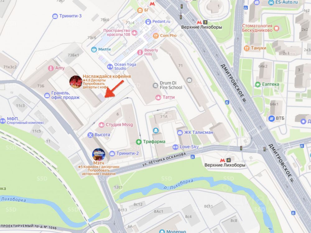 Ближайшая станция метро - Верхние Лихоборы, 8 минут пешком. Помещение расположено на 1-ом этаже 11-ти этажного жилого дома. Высокий пешеходный и автомобильный трафик. Крупный жилой массив. Помещение располагается в жилом комплексе ''Тринити'' во дворе дома на закрытой территории. В комплексе 1566 квартир, рядом находится бизнес-центр и торговый центр.
