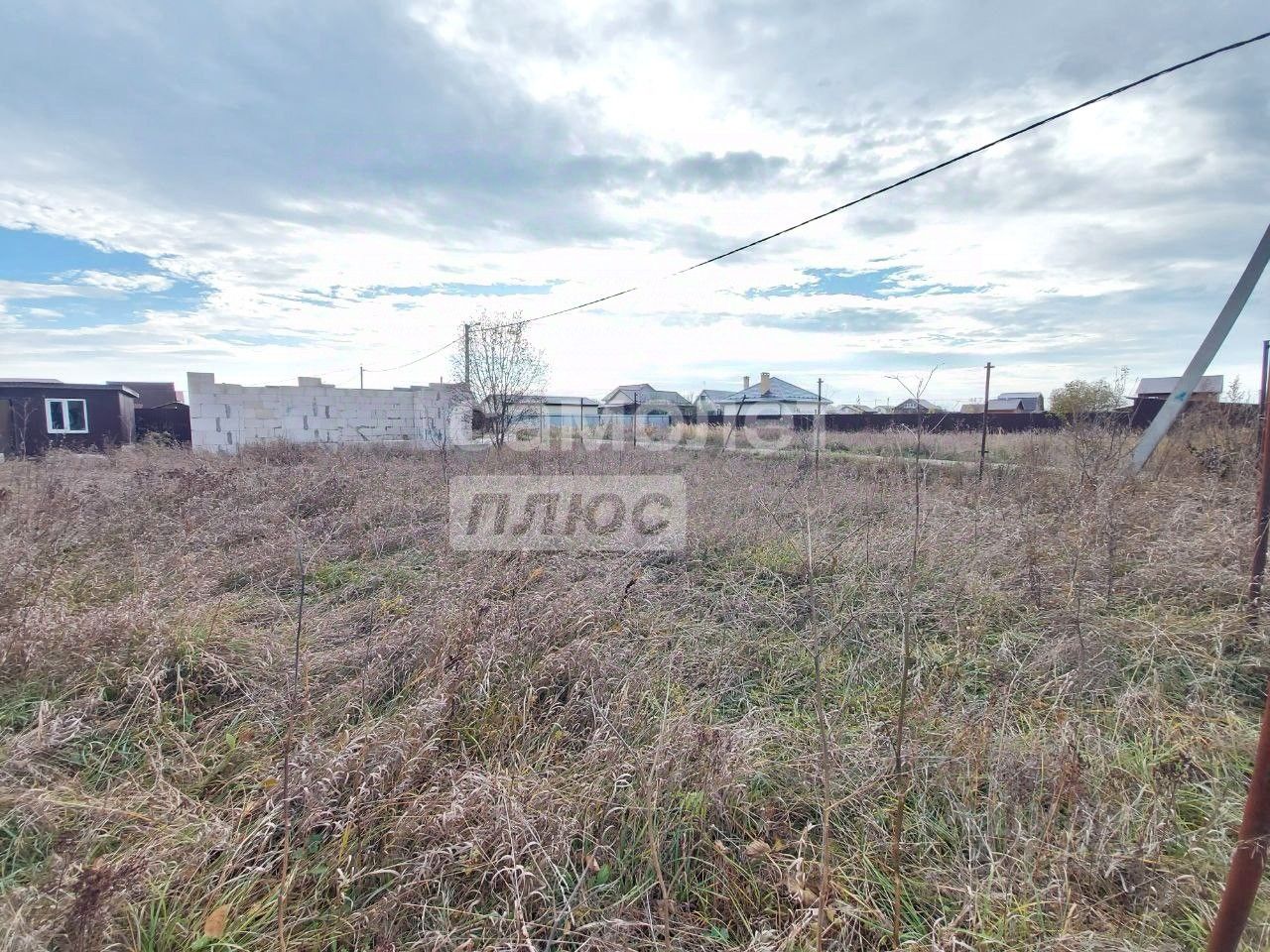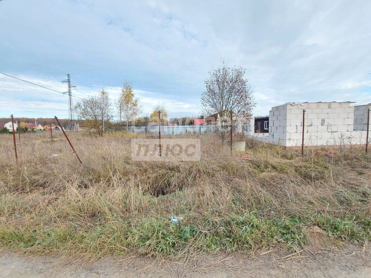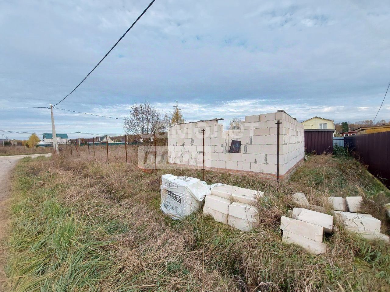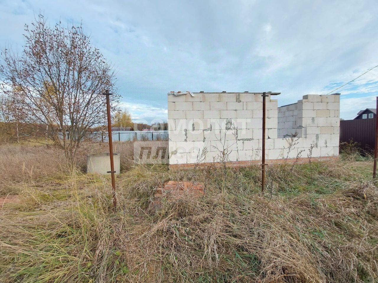 Так же на участке расположена бытовка, по периметру с трех сторон установлены металлические столбы под забор, по заднему фасаду забор профнастил.